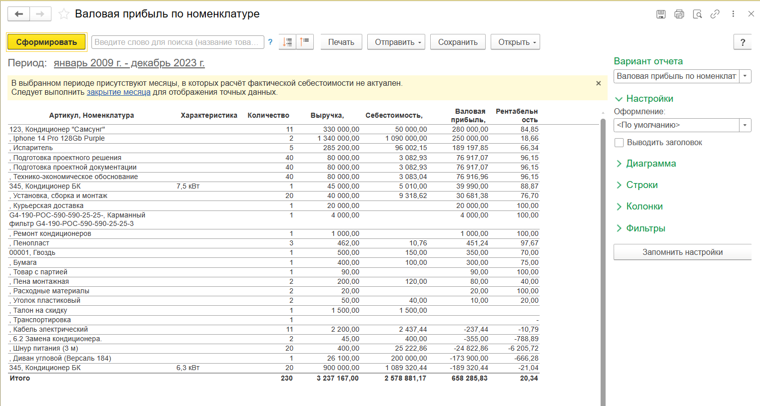 · Валовая прибыль по номенклатуре – данный отчет отображает количество продаж, сумму выручки, себестоимость, валовую прибыль и рентабельность по номенклатуре;