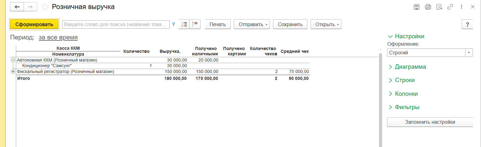 · Розничная выручка – Данный отчет показывает сумму розничной выручки, детализированная формами оплаты. Отчет формируется в разрезе касс ККМ;