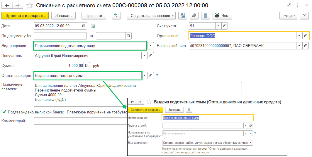 Выдача подотчетных сумм