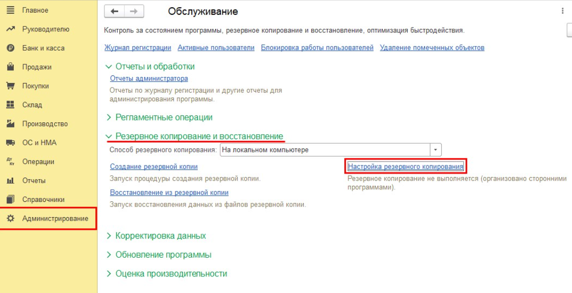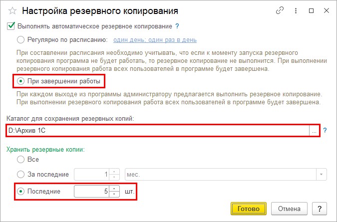 Существует 2 варианта выполнения бэкапа, при завершении работы 1С, а также по расписанию, которое было предварительно настроено. Рассмотрим настройка каждого из них.