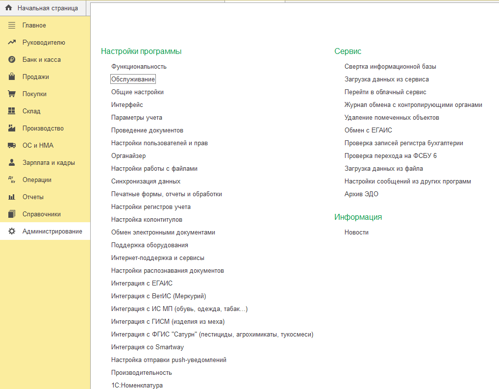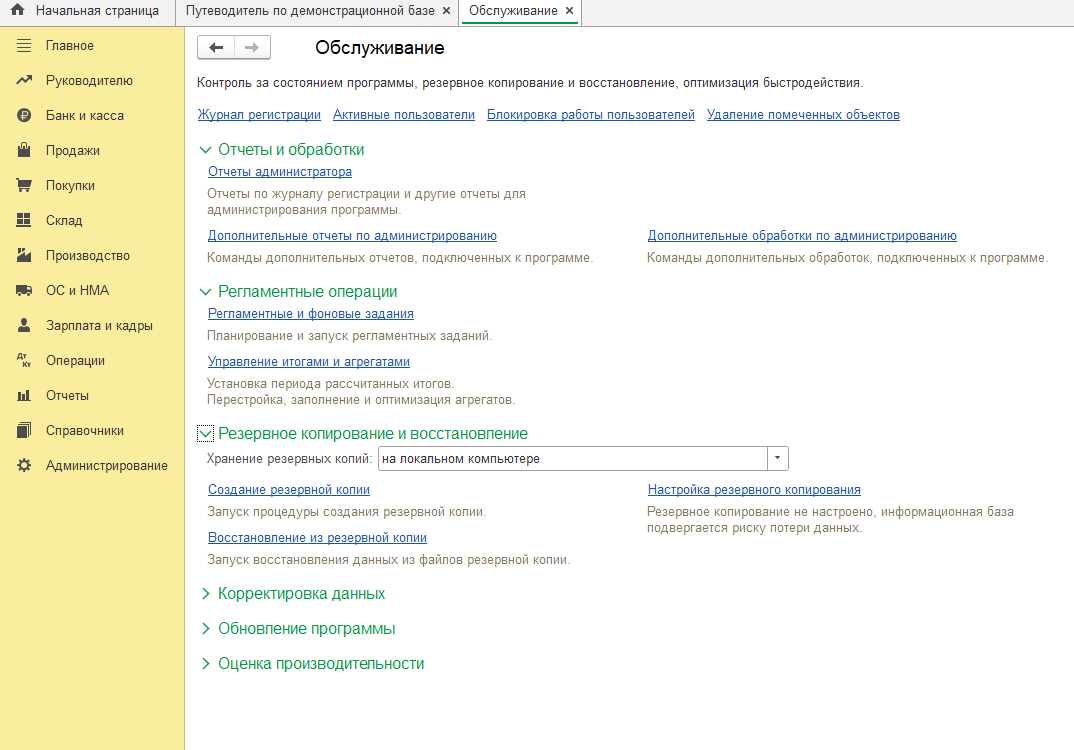 Для осуществления резервного копирования информационной базы необходимо зайти в раздел «Администрирование», далее в «Обслуживание».