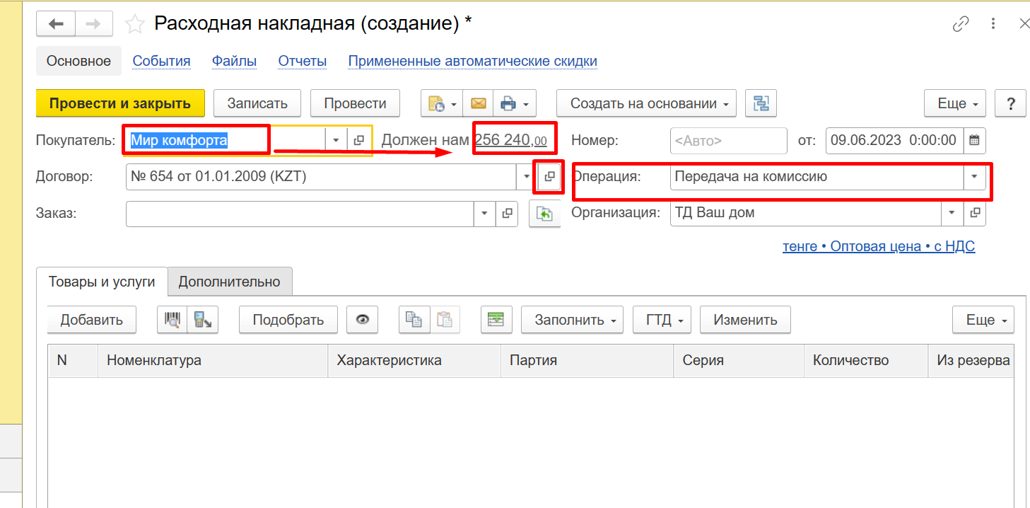 Енді тауарларды комисионерге беру үшін құжатты рәсімдейміз.