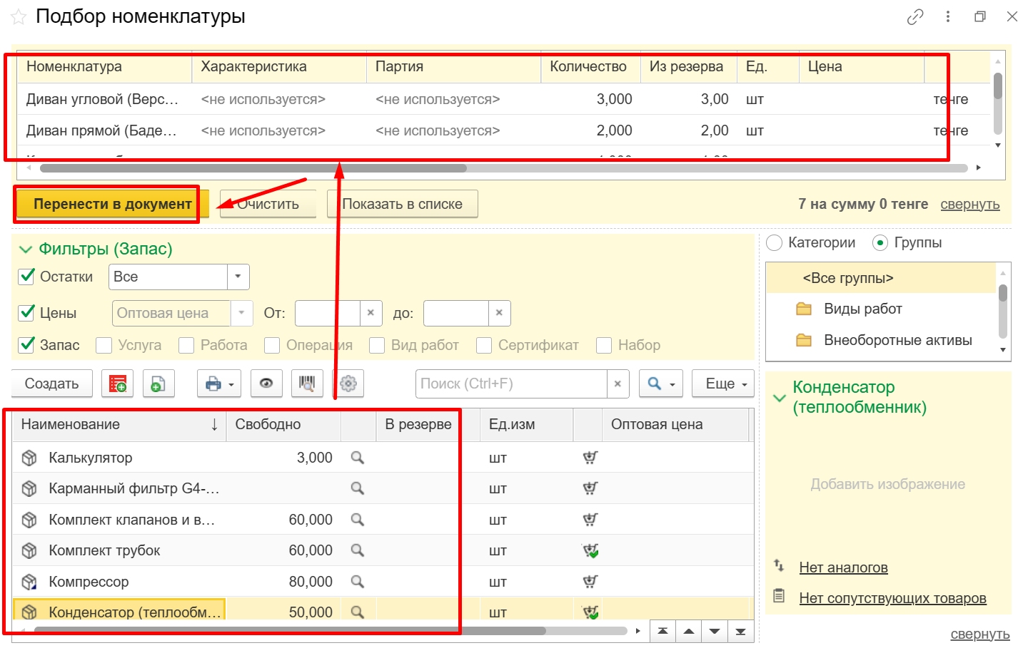 Біз тауарларды таңдаймыз, ол үшін тауарларды 2 рет басамыз. Әрі қарай, біз оларды құжатқа көшіреміз.