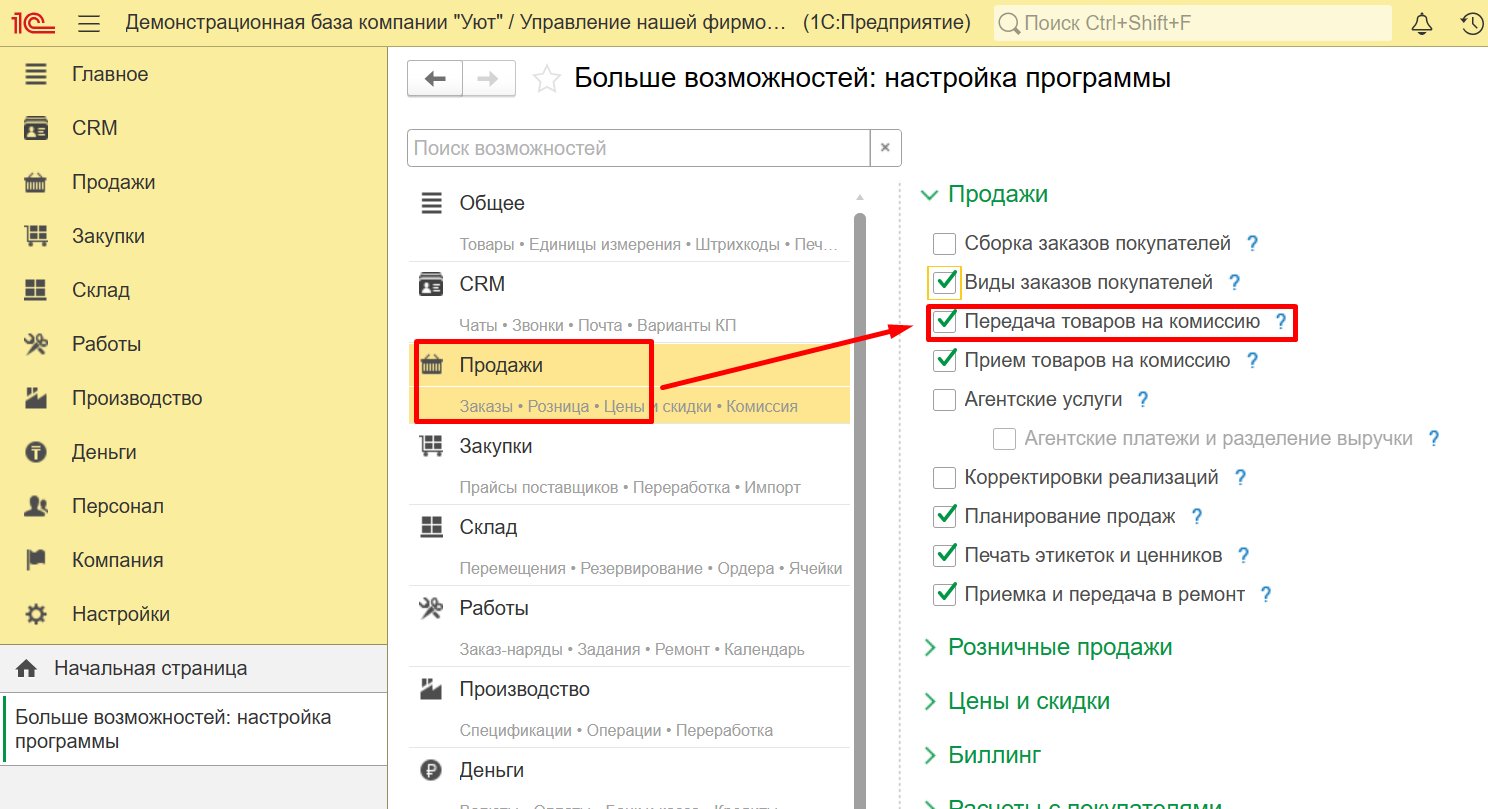 1С: УНФ – та тауарларды комиссионерге сатуға беру мүмкіндігі бар. Бұл бизнес-модель кең танымал, сондықтан бұл функционалдылық сату функционалы бар кез-келген конфигурацияда сақталады.