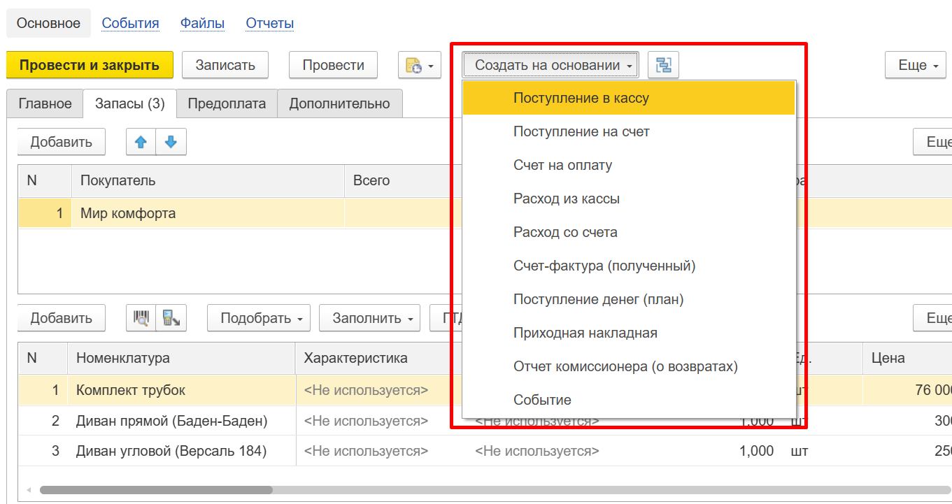 Құжатта біз комиссионерді таңдаймыз. Құжатты қолмен толтыруға болады, бірақ оны негізді толтыру арқылы тезірек жасауға болады. Таңдау батырмасы бойынша негізді толтырамыз.