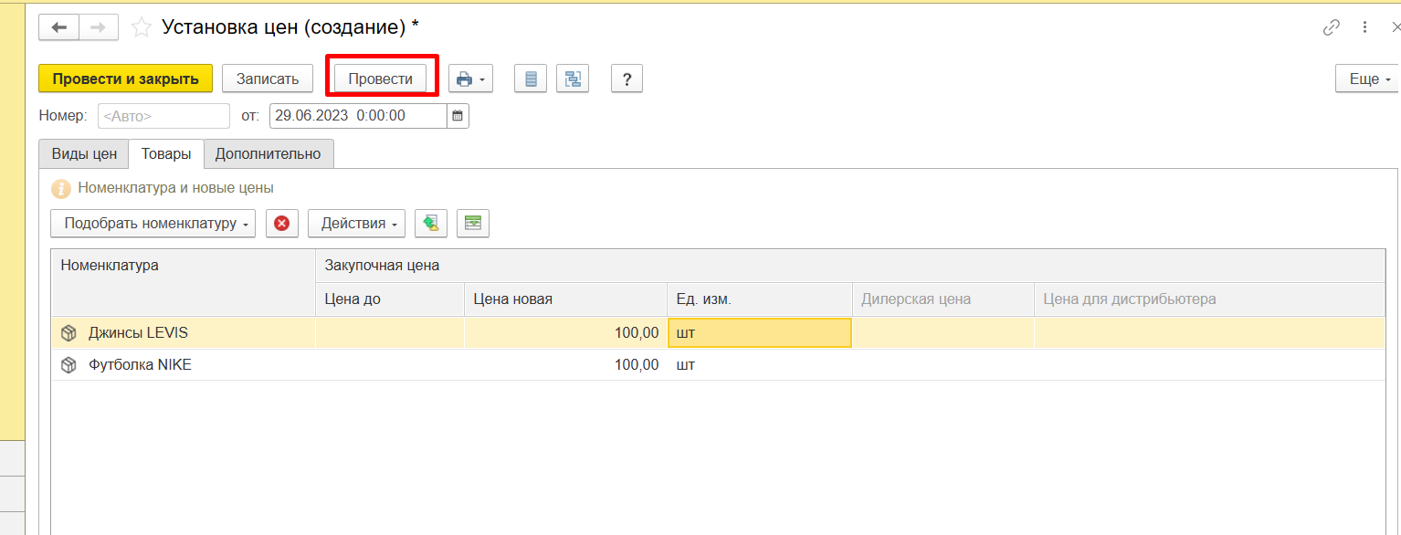 1С сатып алу бағасы толтырылғанын тексереміз, құжатты жүргіземіз.