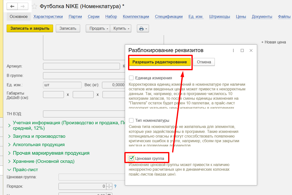 Әрі қарай, номенклатура үшін 1С баға топтарын тағайындау қажет. Ол үшін 1С-да тауар картасын ашып, деректемелерді өңдеуге рұқсат беру үшін тағы бір түймені басыңыз.