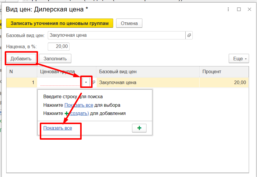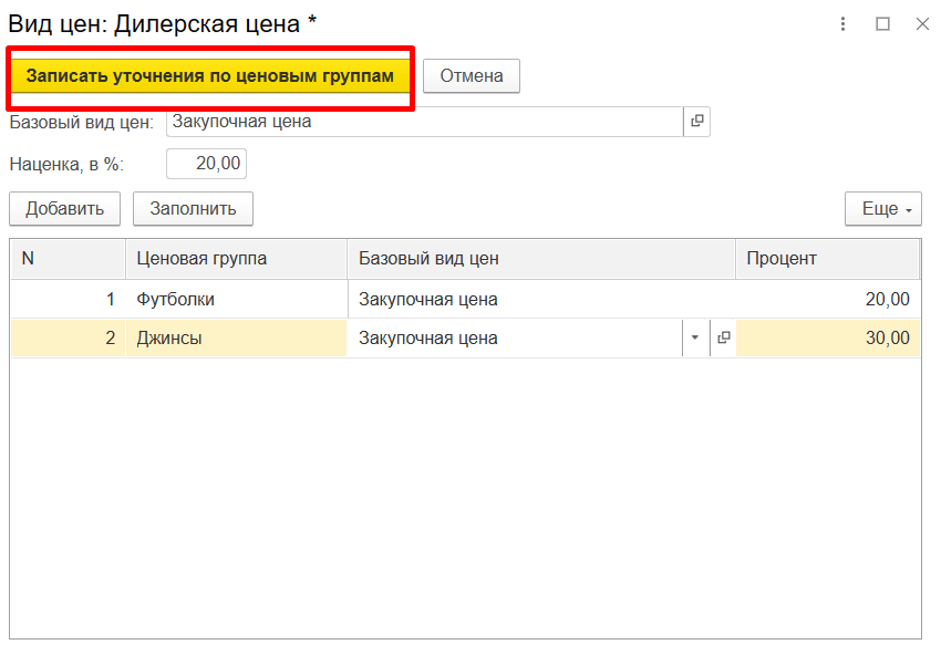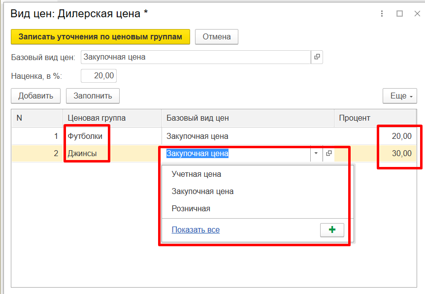 Біз 1С баға топтарын толтырамыз, есептеу үшін базалық бағаларды және үстеме пайызды анықтаймыз. Біз 1С баға топтары бойынша нақтылауды жазамыз.