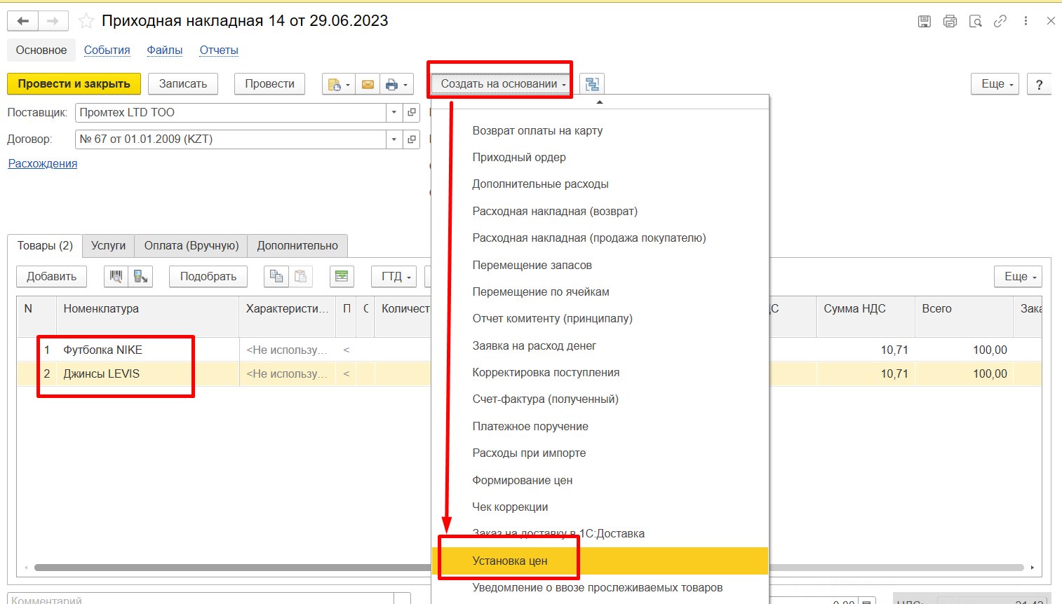 Есептелген бағамен бағаны белгілеу құжаты жасалады, тауарлардың сатып алу бағасы бірдей болды, бірақ сату бағасы әр түрлі бағамен есептелді, өйткені тауарлардың 1С және үстеме пайыздар бойынша әр түрлі баға топтары бар.