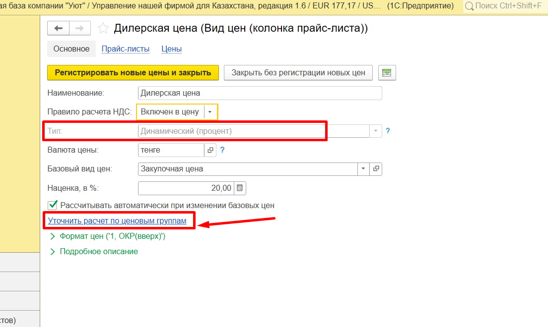 Біз баға көрінісін ашамыз, баға түрі динамикалық (пайыз) немесе динамикалық (формула) болуы керек.