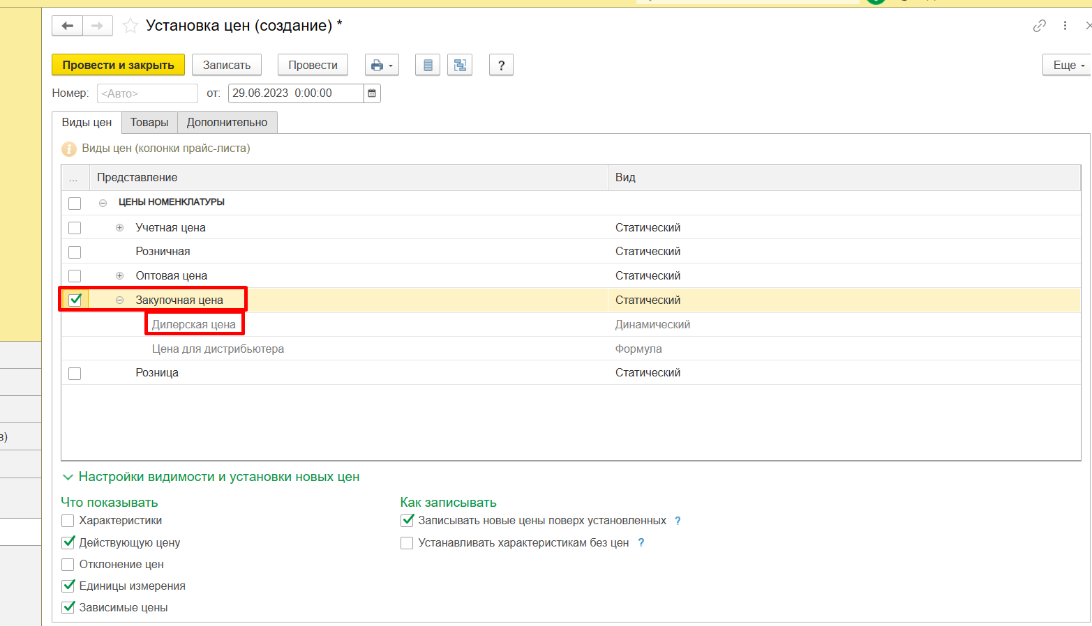 Әрі қарай, баға түрлерінің анықтамалығына өтіп, бағаның қажетті түрін тауып, бағаны орнату түймесін басыңыз.