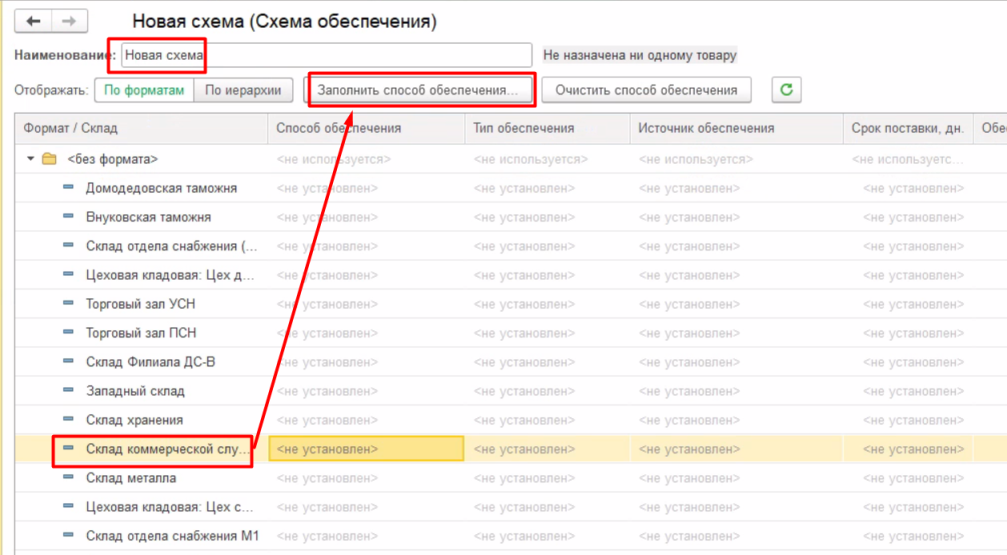Указываем наименование, выделяем склад, для которого необходимо указать созданный ранее способ обеспечения и заполняем способ обеспечения по соответствующей кнопке.