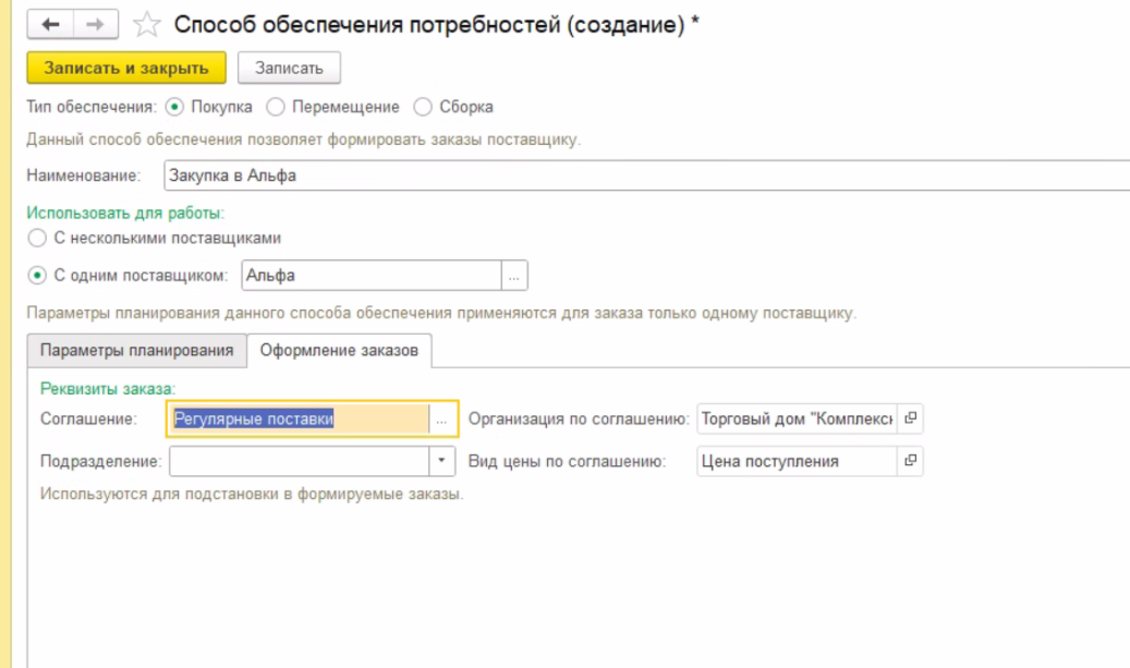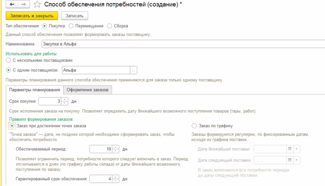 Указываем поставщика, срок покупки, обеспечиваемый период, гарантированный срок обеспечения. Данные параметры влияет на расчет количества закупаемых товаров.