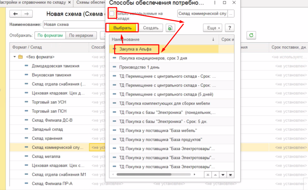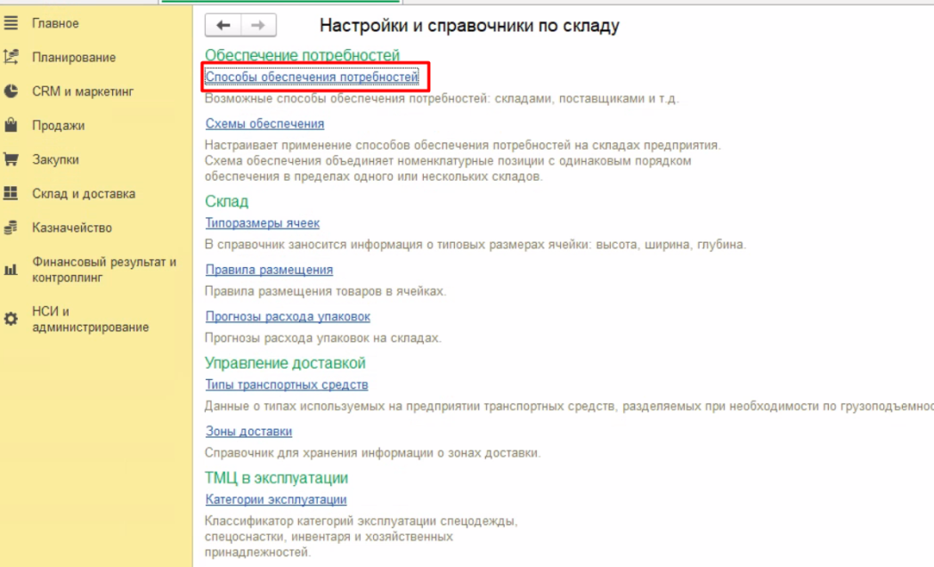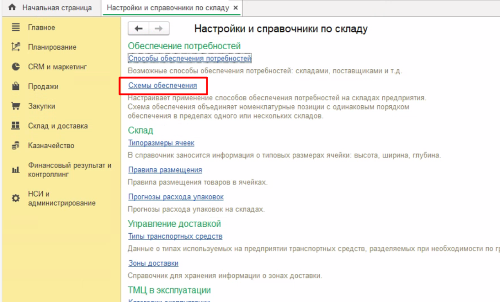 Также, для более корректной работы обеспечения потребностей 1С необходимо настроить способы и схемы обеспечения. Настройки находятся в разделе Склад.