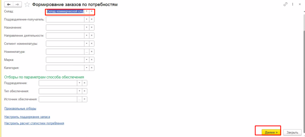 Устанавливаем отбор по складу, а также другие желаемые отборы. Жмем Далее.