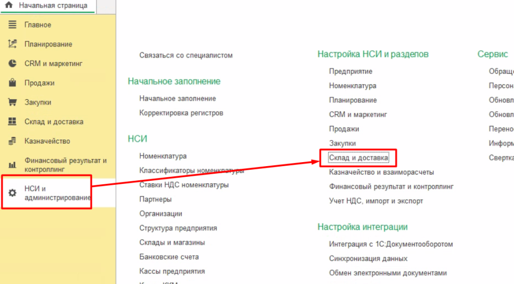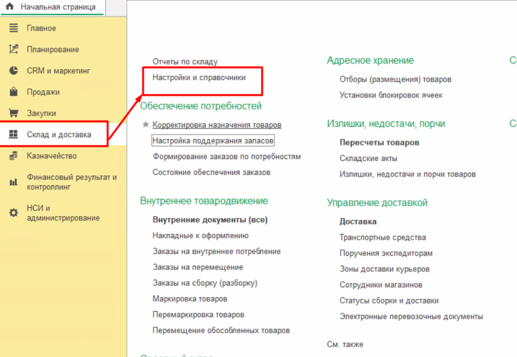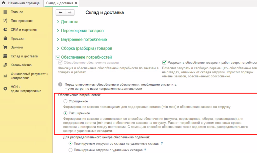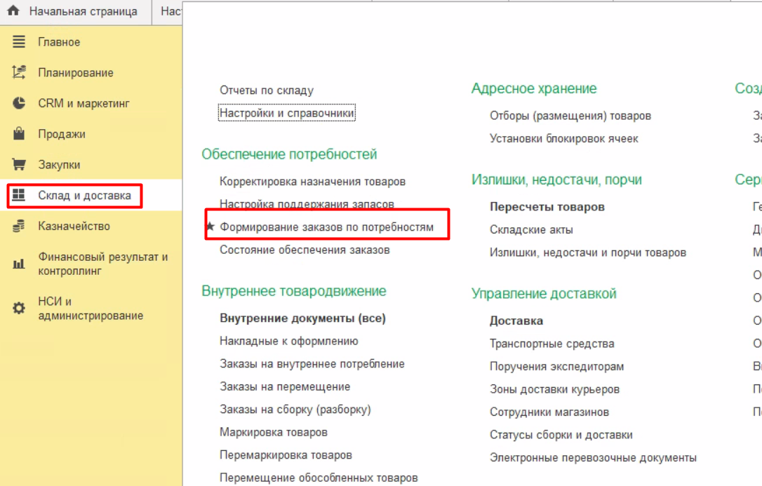 Настройки обеспечения потребностей 1С находятся в разделе Склад.