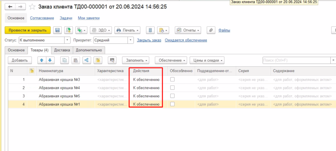 Теперь продемонстрируем процесс автоматического создания заказа поставщику. Создаем заказ клиента, заполняем необходимую информацию и проводим документ. Более подробно по заполнению заказа клиента можно посмотреть в предыдущей статье. На вкладке Товары устанавливаем действие К обеспечению. Обычно данное действие заполняется по умолчанию. Товары только с данным действием регистрируется в программе как потребность, которую необходимо обеспечить.