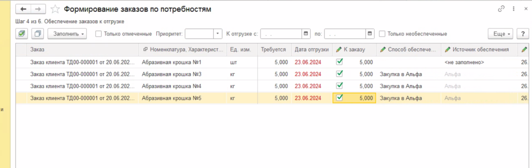Ждем Далее и переходим на четвертый шаг, в котором отображены конкретные потребности по заказам клиентов.