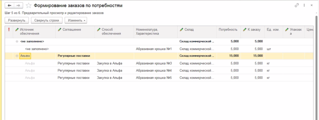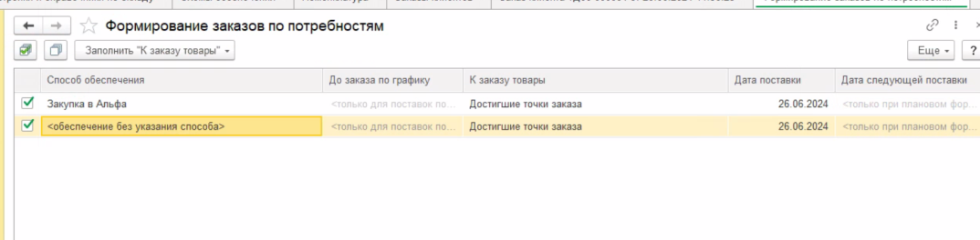 На первом шаге отобразится список потребностей с детализацией по способам обеспечения. Как видим, в списке есть строчка без указания способа обеспечения. Это значит, что есть потребность по товарам, у которых не присвоена схема или способ обеспечения.