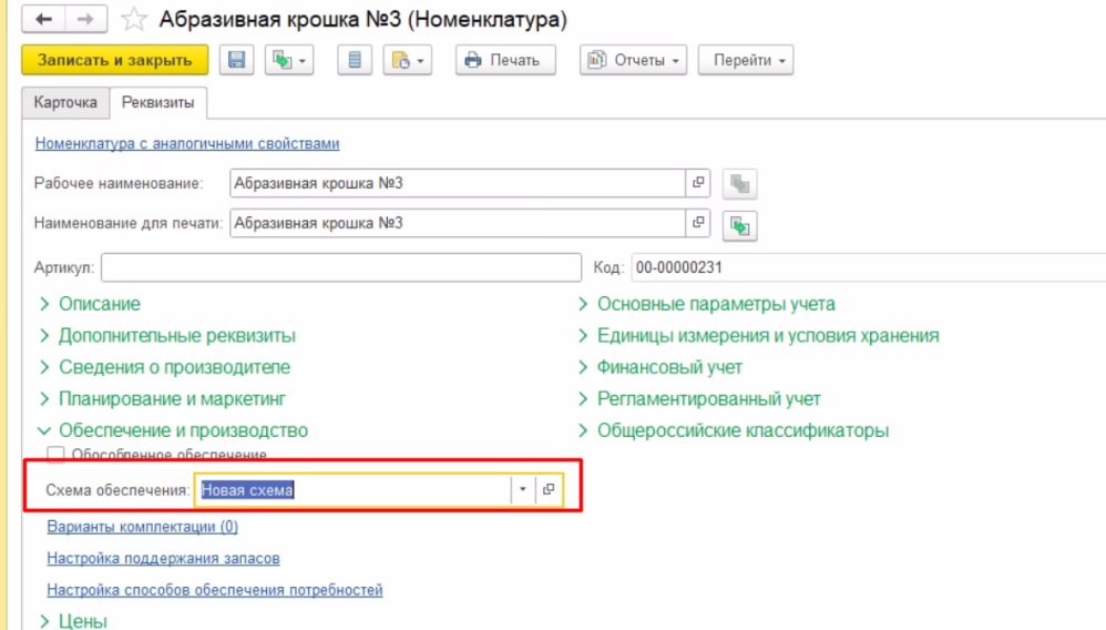 Далее необходимо настроить схему обеспечения 1С. Открываем соответствующий справочник и создаем новый элемент.