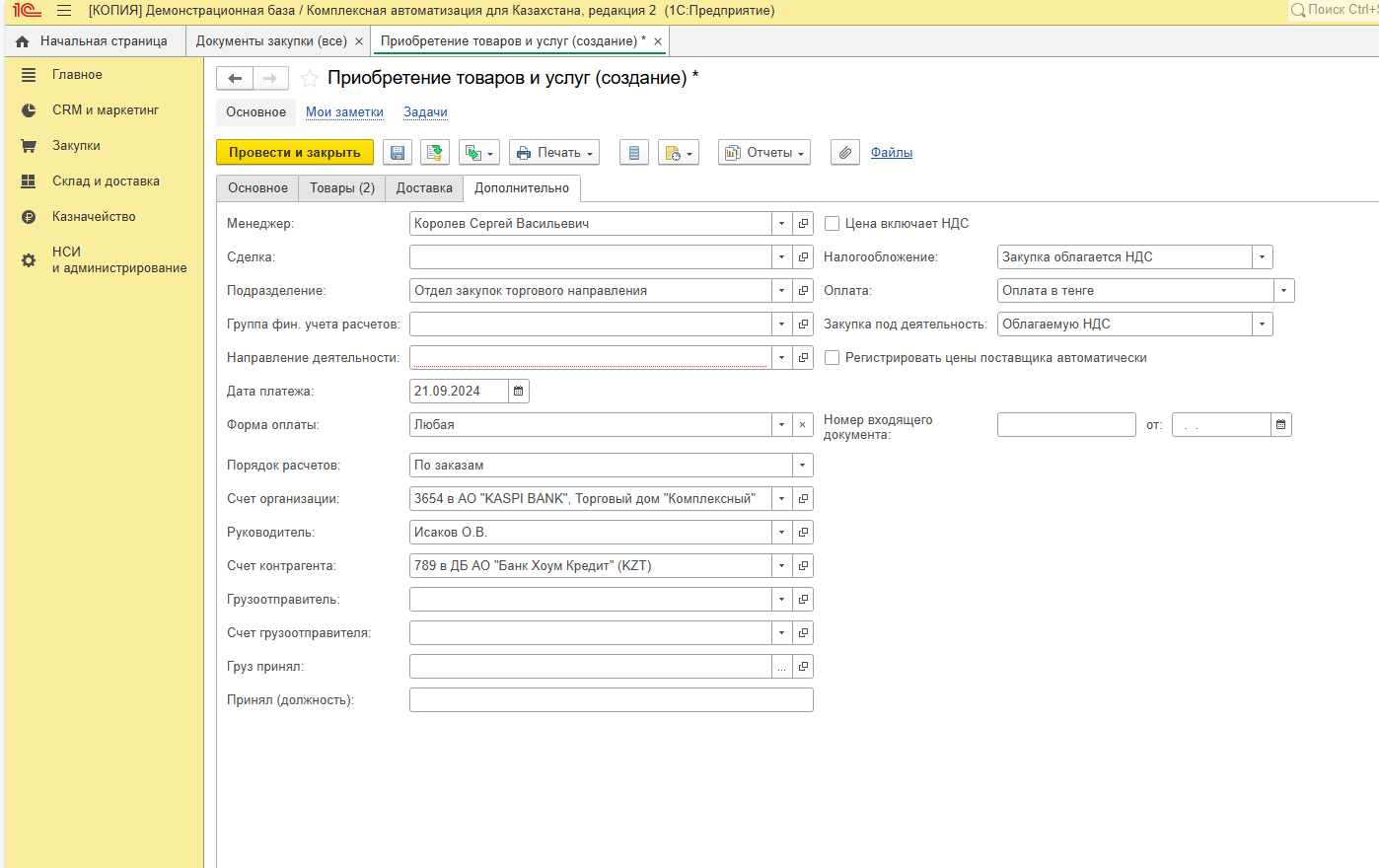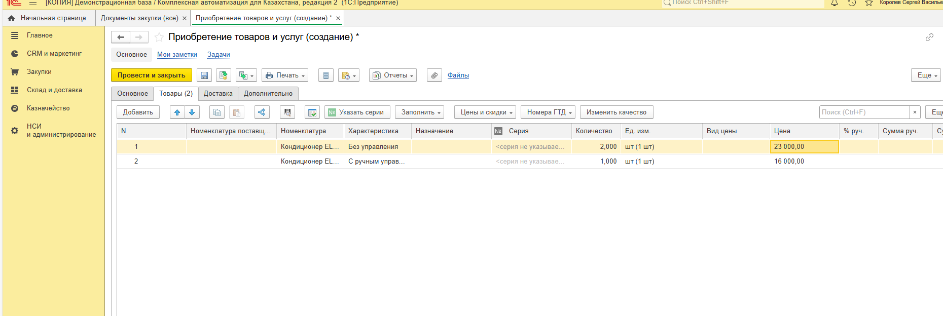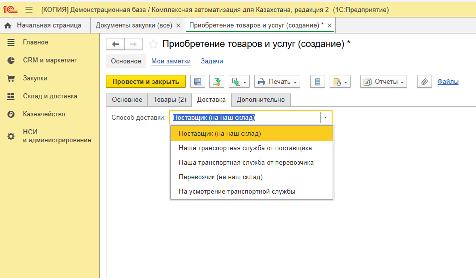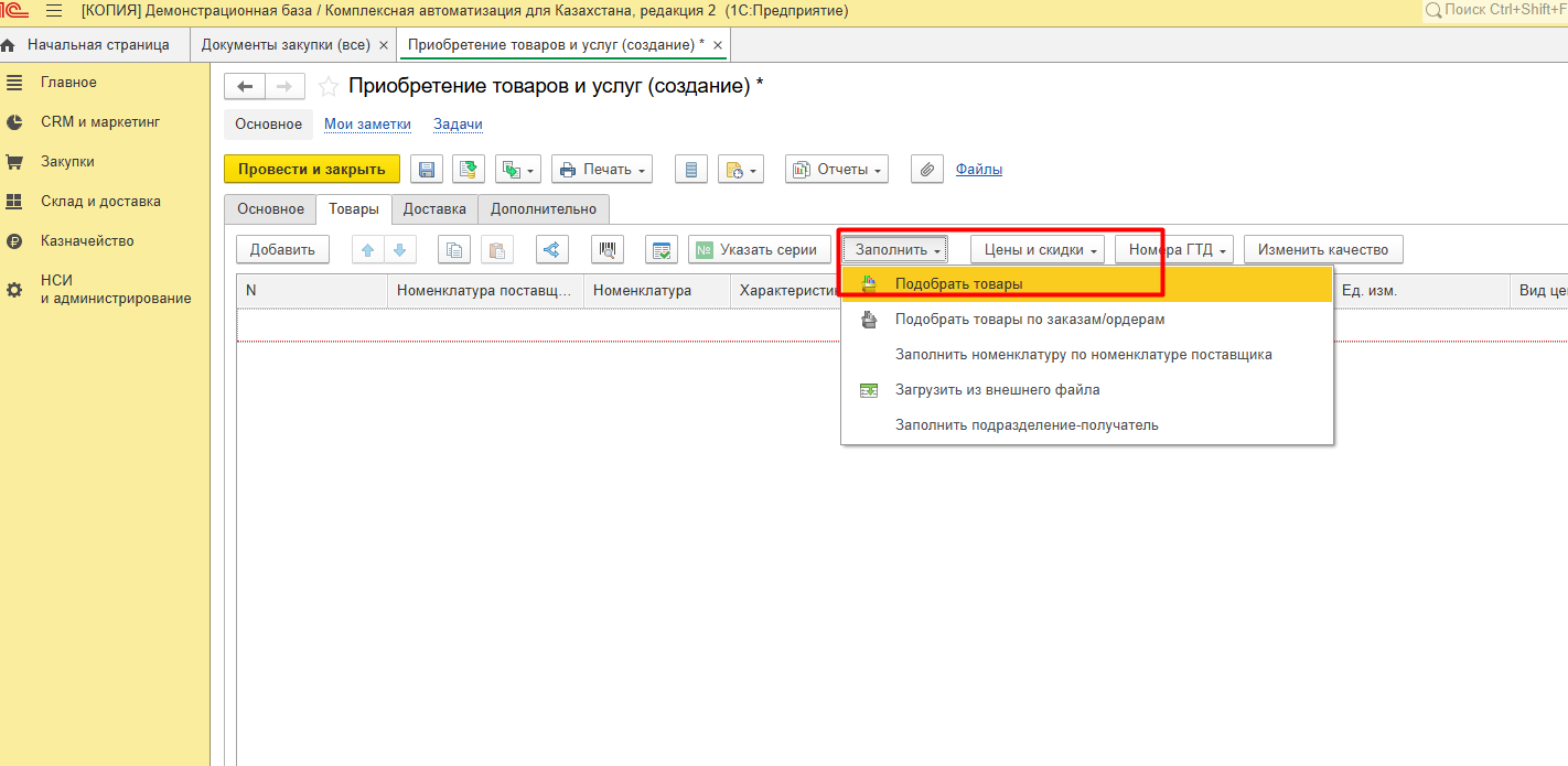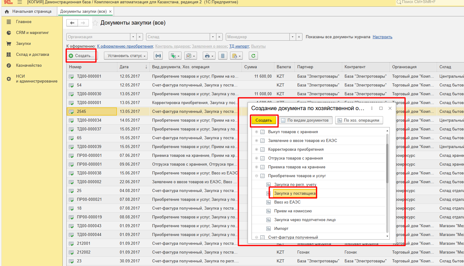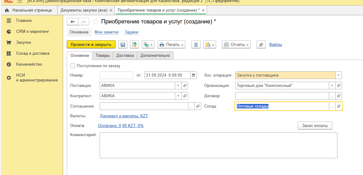 2. Как оформить поступление товаров в 1С: КА для Казахстана