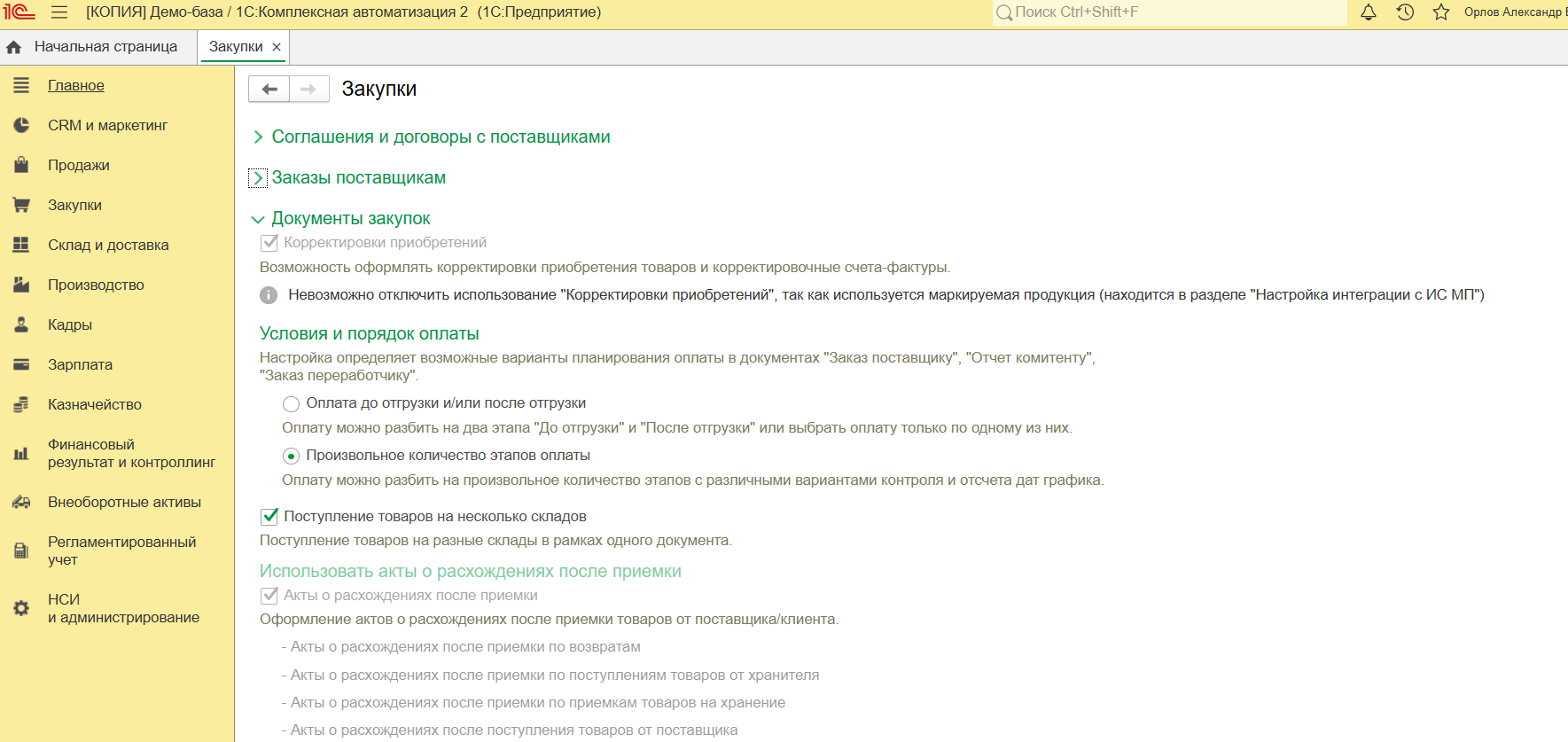 · Договоры с поставщиками - при включении данной опции в системе появится возможность создавать соответствующий объект. В нем определяются основная информация сторон, а также определяется детализация взаиморасчетов;