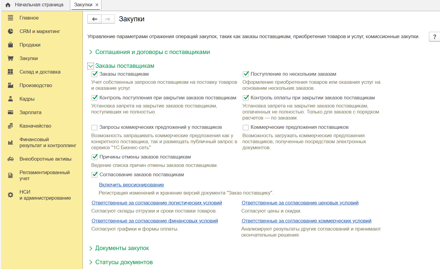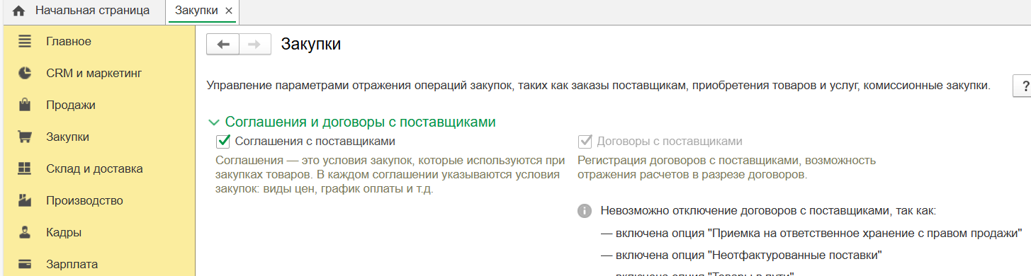 · Соглашения с поставщиками – при включении данной опции в системе появится возможность создавать соответствующий объект. В нем можно определить условия оплаты, а также вид цены поставщика. Эти данные будут автоматически заполняться в документах;