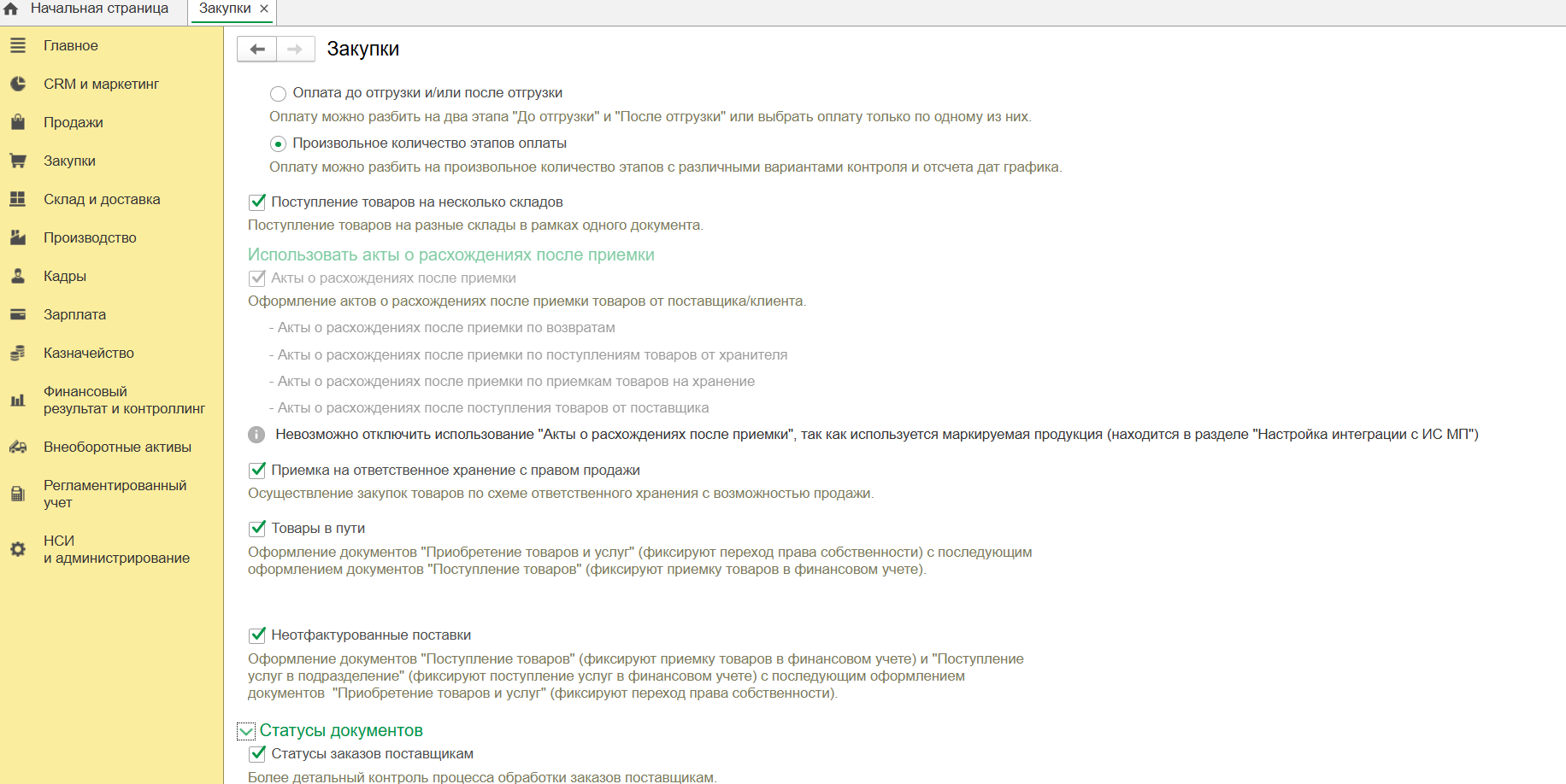 · Корректировки приобретения – при включении данной опции в программе появляется возможность регистрировать отклонения после оформления документа поступления;