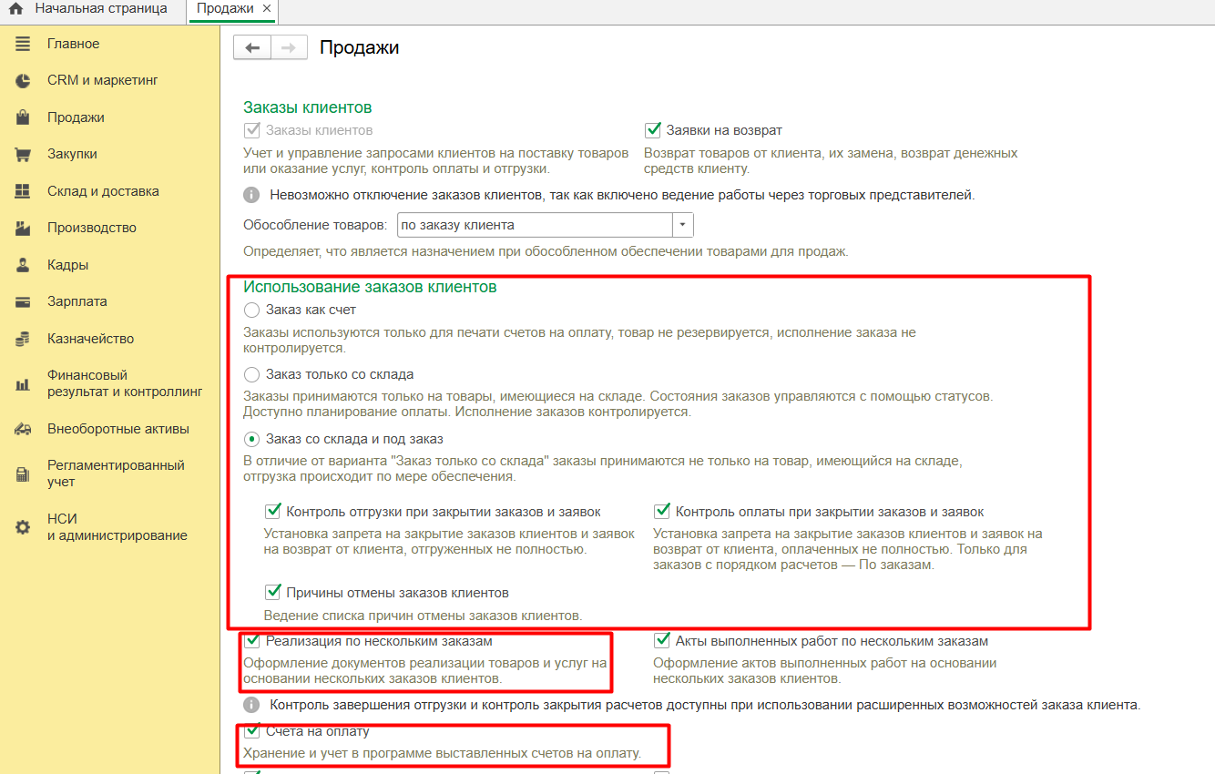 · Использование заказов клиента – в данной настройке мы определяем вариант использования заказов. Полный функционал использования заказов включается при варианте – Заказ со склада и под заказ. Выбираем его;