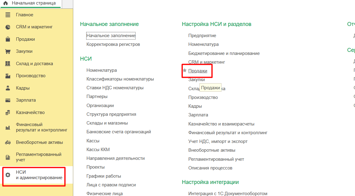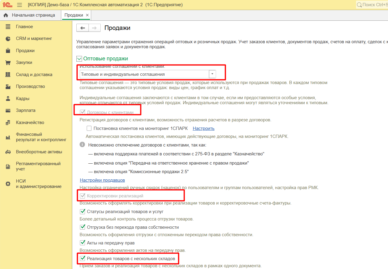 Открываем настройки подсистемы продаж, где представлены следующие основные настройки, которые касаются процесса оформление продажи: