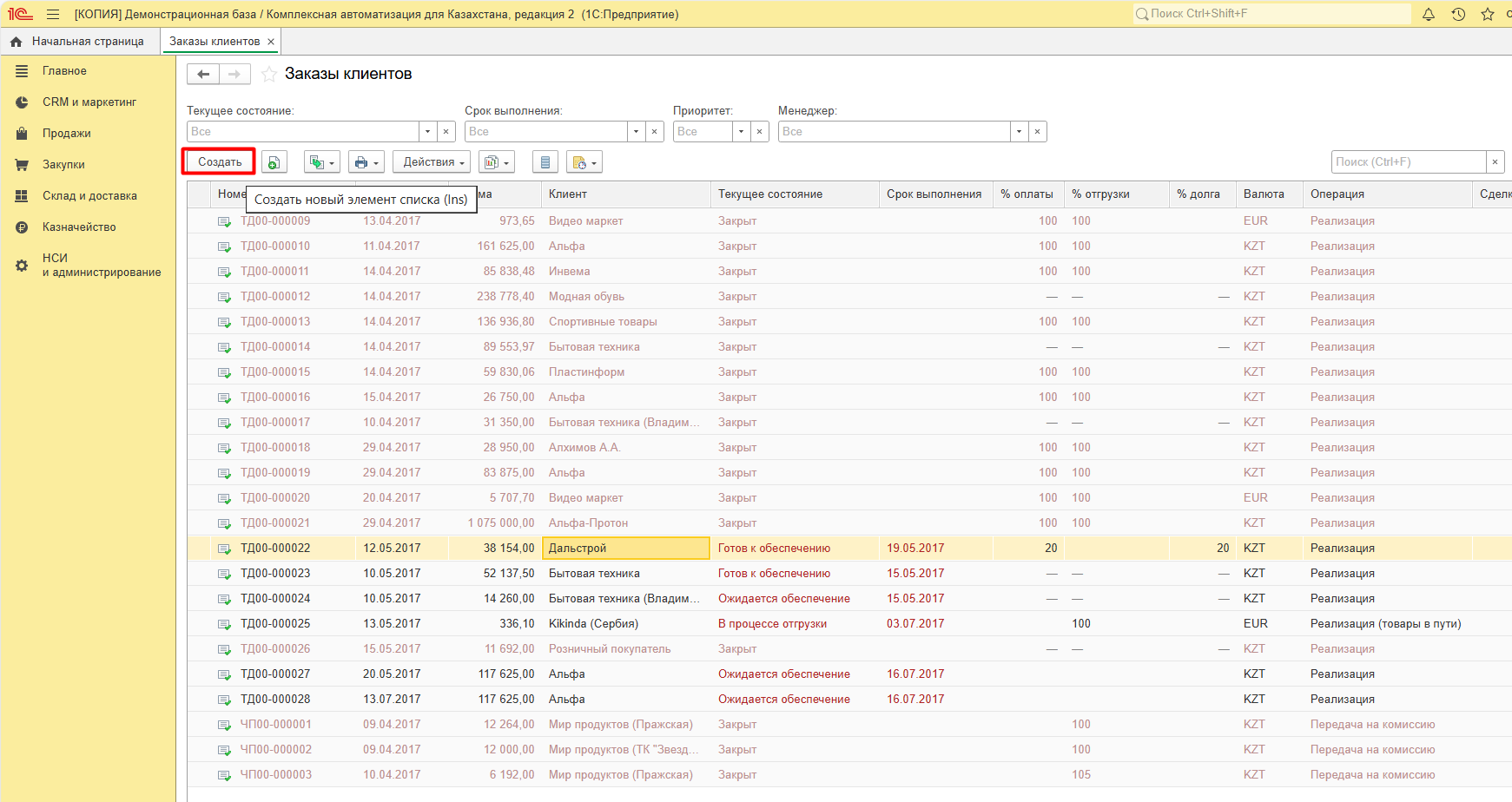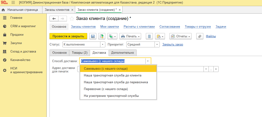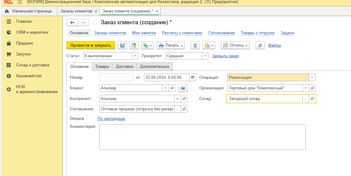 Первый шаг в регистрации продажи — это создание «Заказа клиента». Этот документ фиксирует основные условия сделки: наименование продукции, количество, цена и сроки поставки товара. Информация о клиенте и условиях оплаты также вносится на этом этапе, что позволяет системе автоматически отслеживать выполнение условий и сроки.