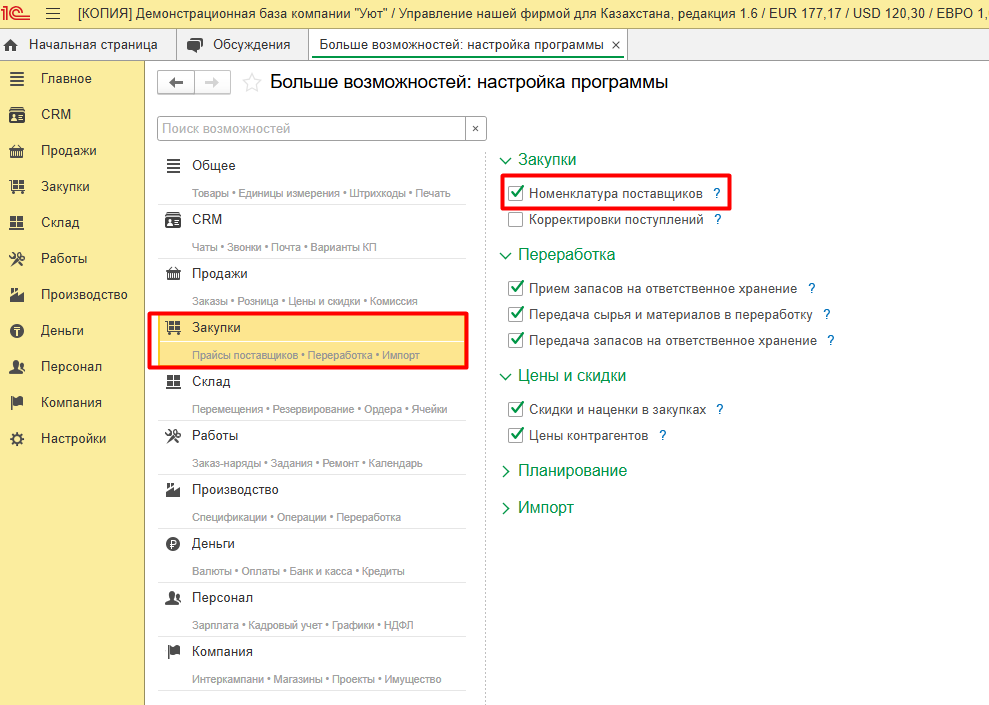 Для возможности использования функционала номенклатуры поставщиков в 1С необходимо перейти в настройки подсистемы Закупки и активировать соответствующую функциональную опцию.
