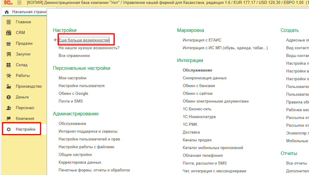 Переходим к настройкам 1С: УНФ для Казахстана.