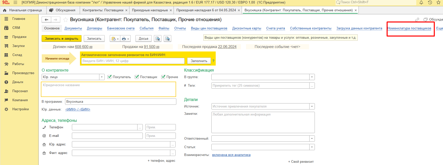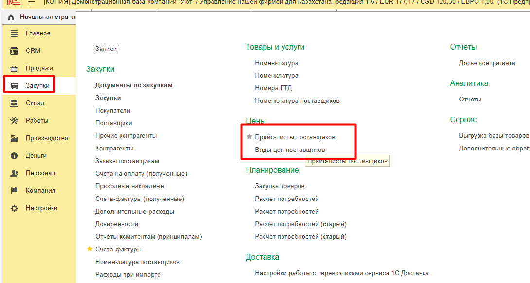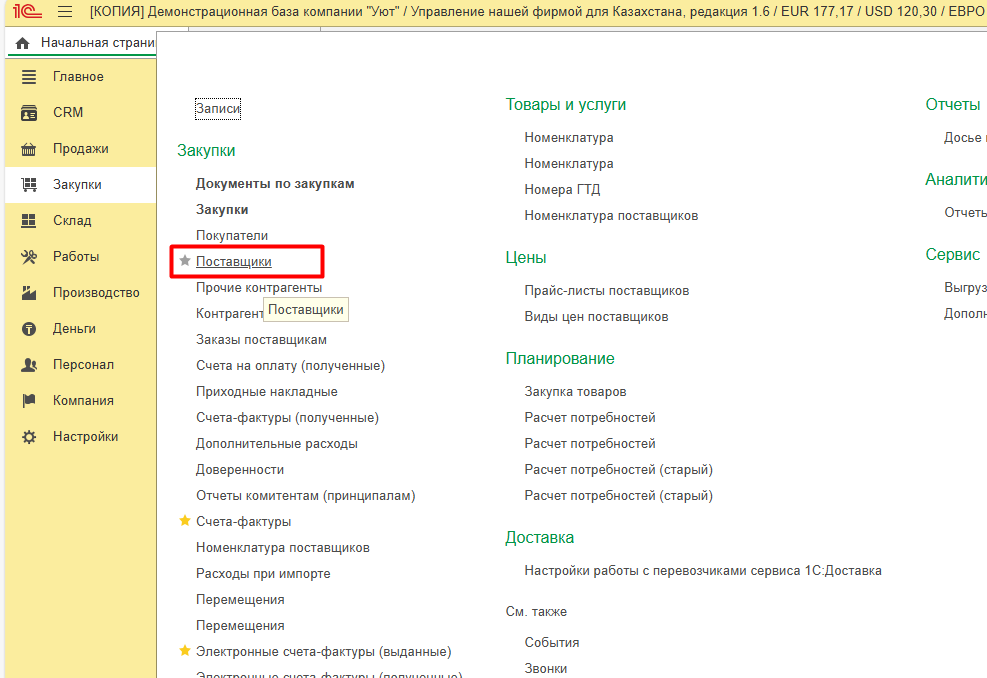 2. Настройка номенклатуры поставщика в 1С: УНФ для Казахстана