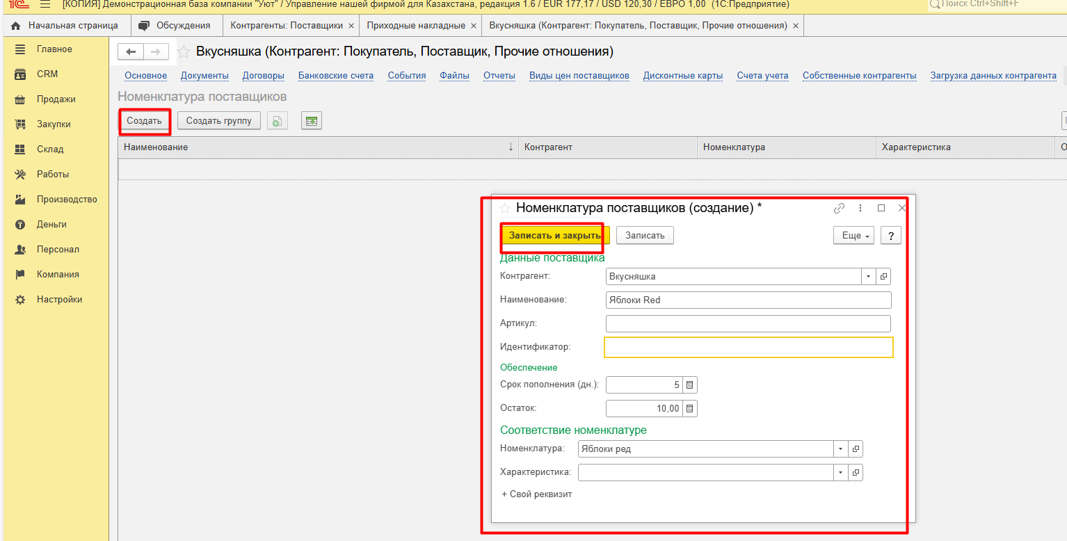 3. Создание номенклатуры поставщика в конфигурации 1С: УНФ для Казахстана