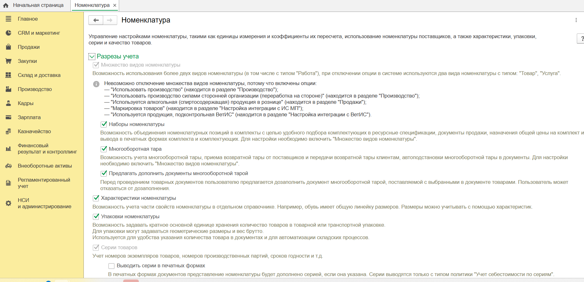 · Множество видов номенклатуры – при включении данной опции в программе появляется возможность использовать более одного вида. Разные виды необходимы, как минимум, чтобы создавать карточки товаров с разными типами номенклатуры. Также разные виды номенклатуры используется для номенклатуры с разными настройками разрезов учета, например, по определенной номенклатуре необходим учет только по характеристикам, по другой группе номенклатуры по сериям товаров;