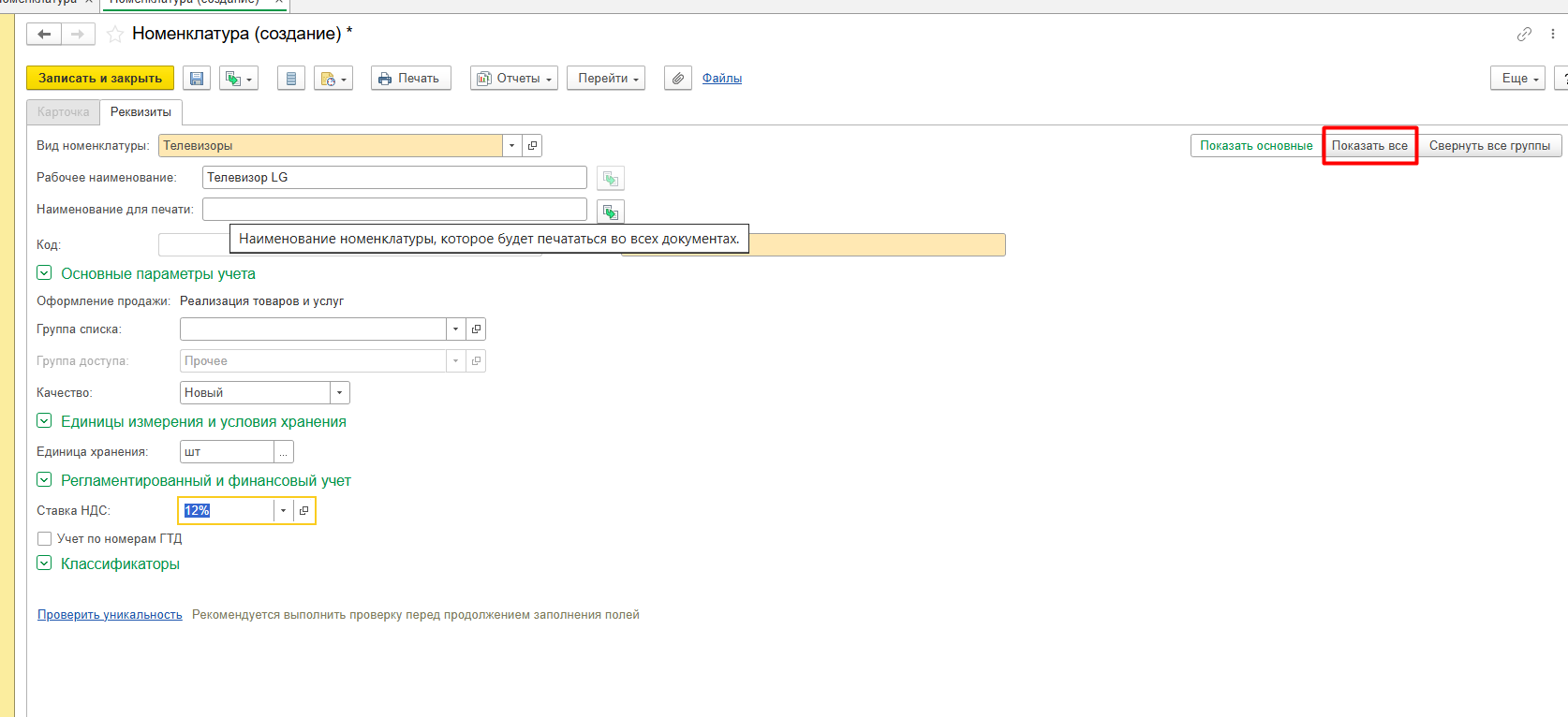 В карточке заполняем необходимые поля. Чтобы увидеть все реквизиты нажимаем на команду Показать все.
