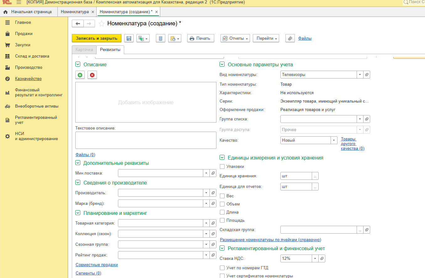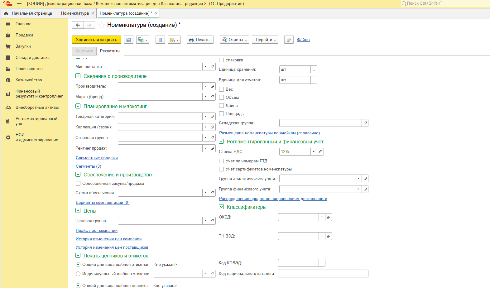 2. Как создать номенклатуру в 1С: КА для Казахстана