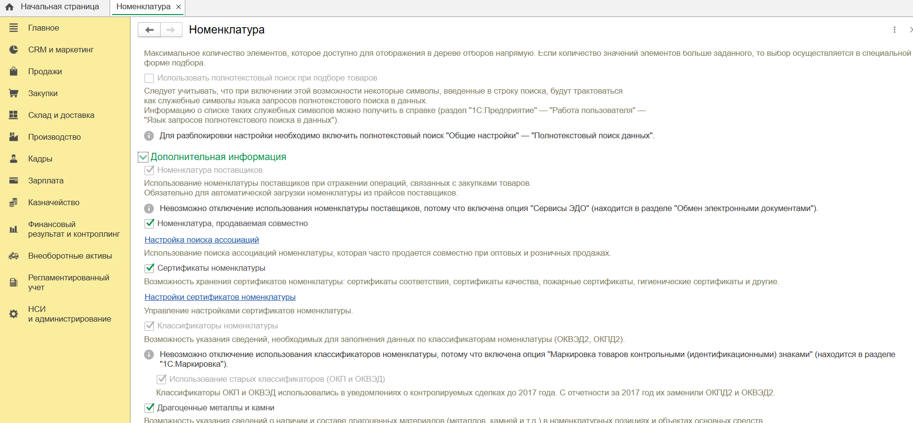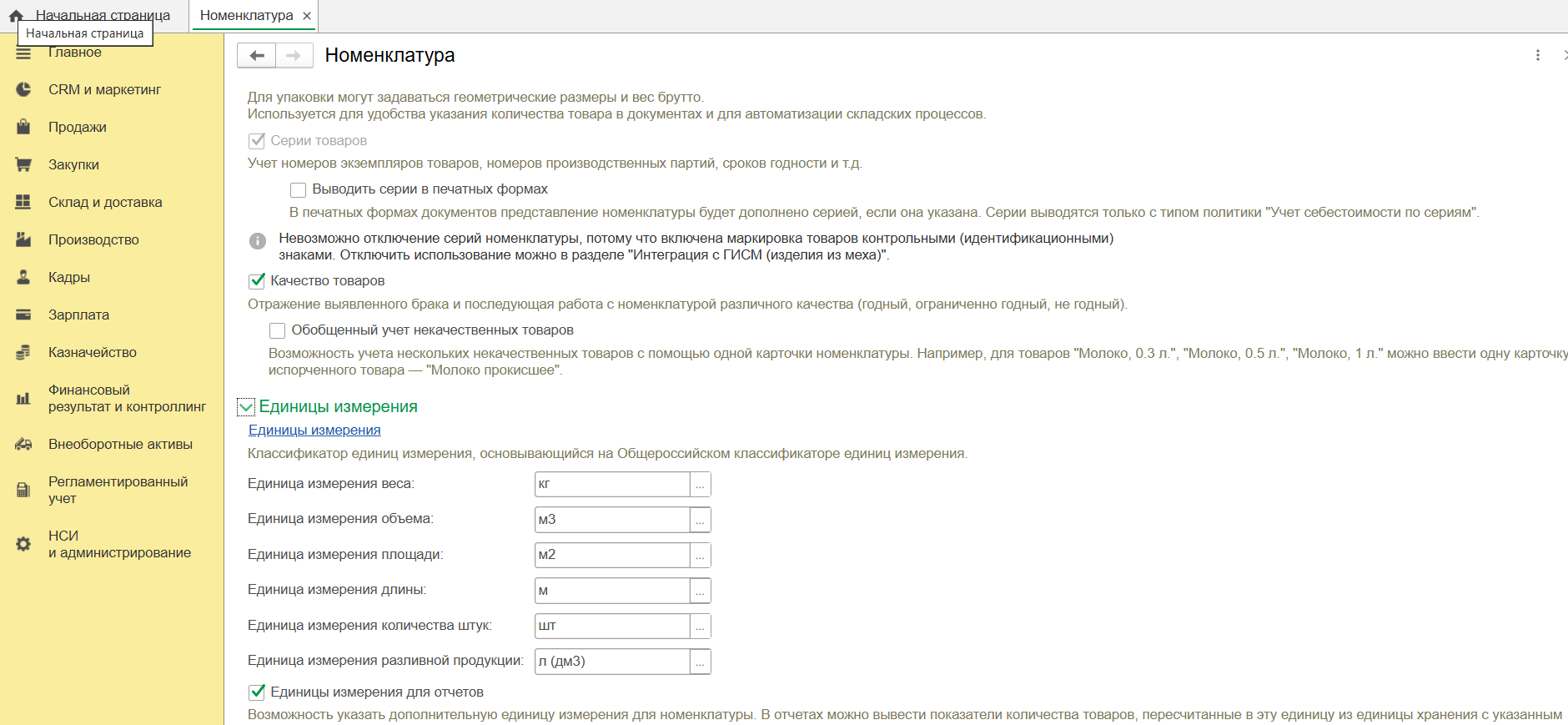 1. Параметры учета номенклатуры в 1С: КА для Казахстана