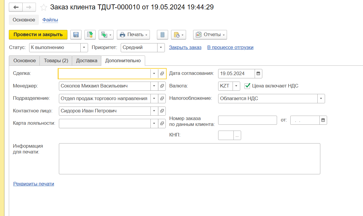 На вкладке Доставка есть возможность указать способ доставки, если необходим учет доставки товаров до клиента. Обычно используется, когда в компании имеется свой служба логистики (со своими или привлекаемыми машинами).