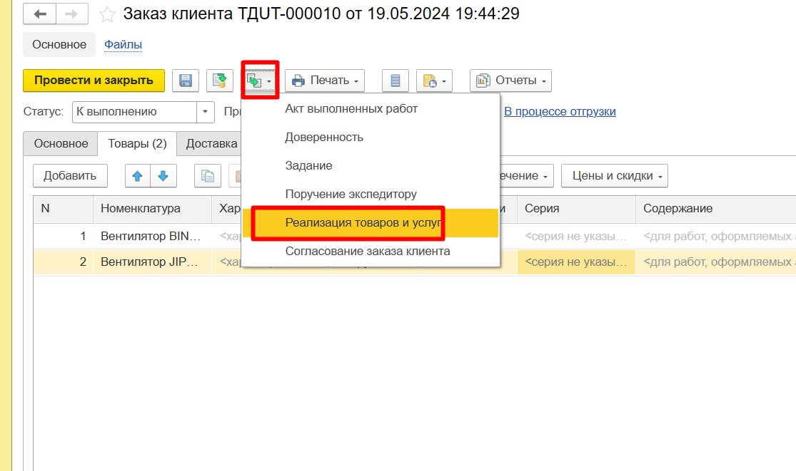 Открываем созданный заказ клиента и создаем реализацию. Документ заполняется всеми необходимыми реквизитами, которые были заполнены в документе заказ клиента. Проводим документ.
