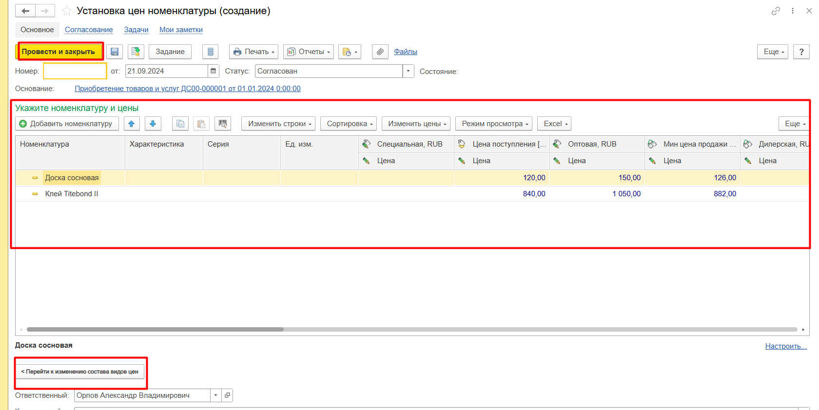 Откроется документ установки цен с товарами из документа закупки. В колонках документа представлены виды цен с рассчитанными ценами. По команде Перейти к изменению состава видов цен можно выбрать только те виды цен, которые нужны. Цены также можно подкорректировать при необходимости вручную. Проводим документ.