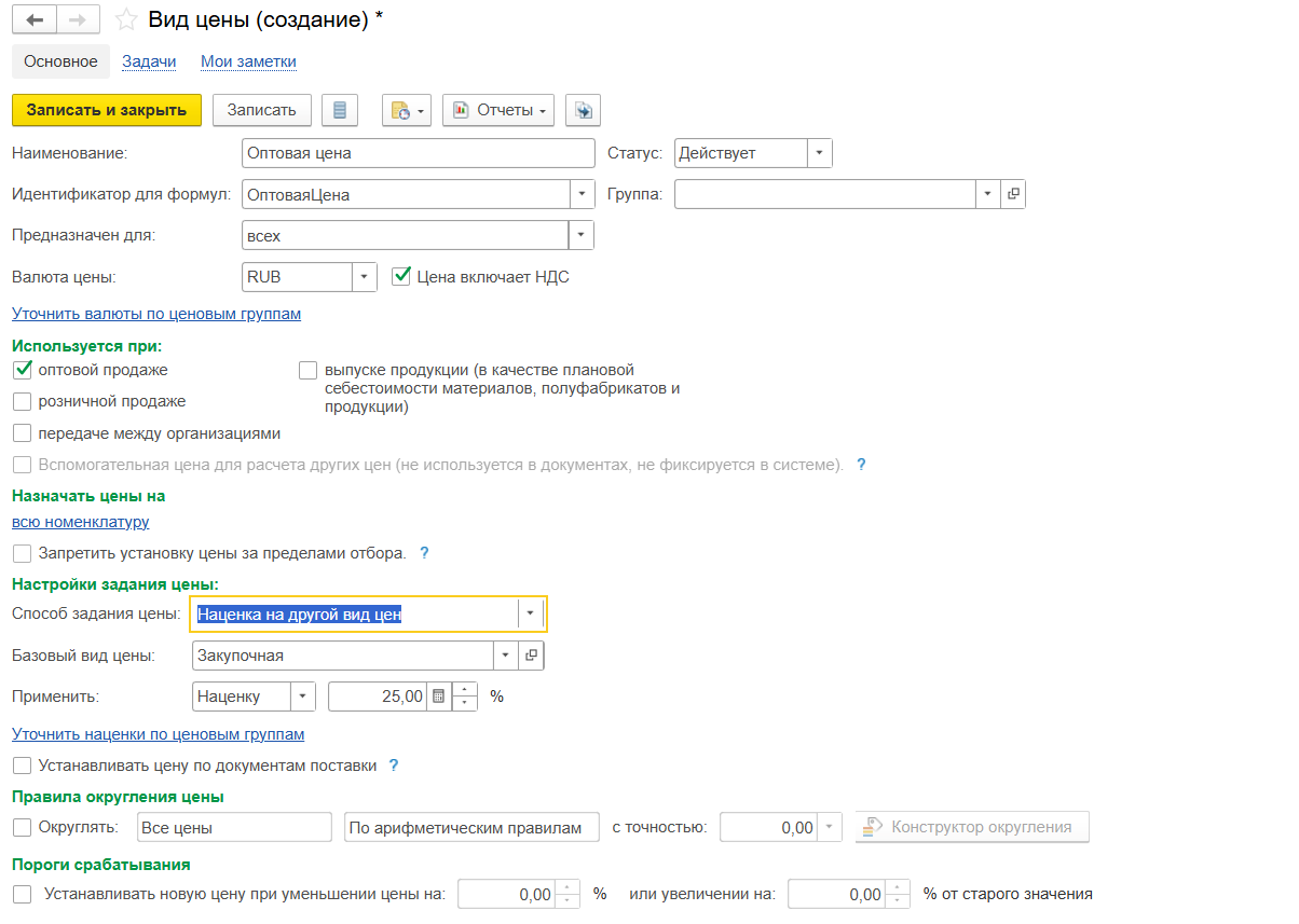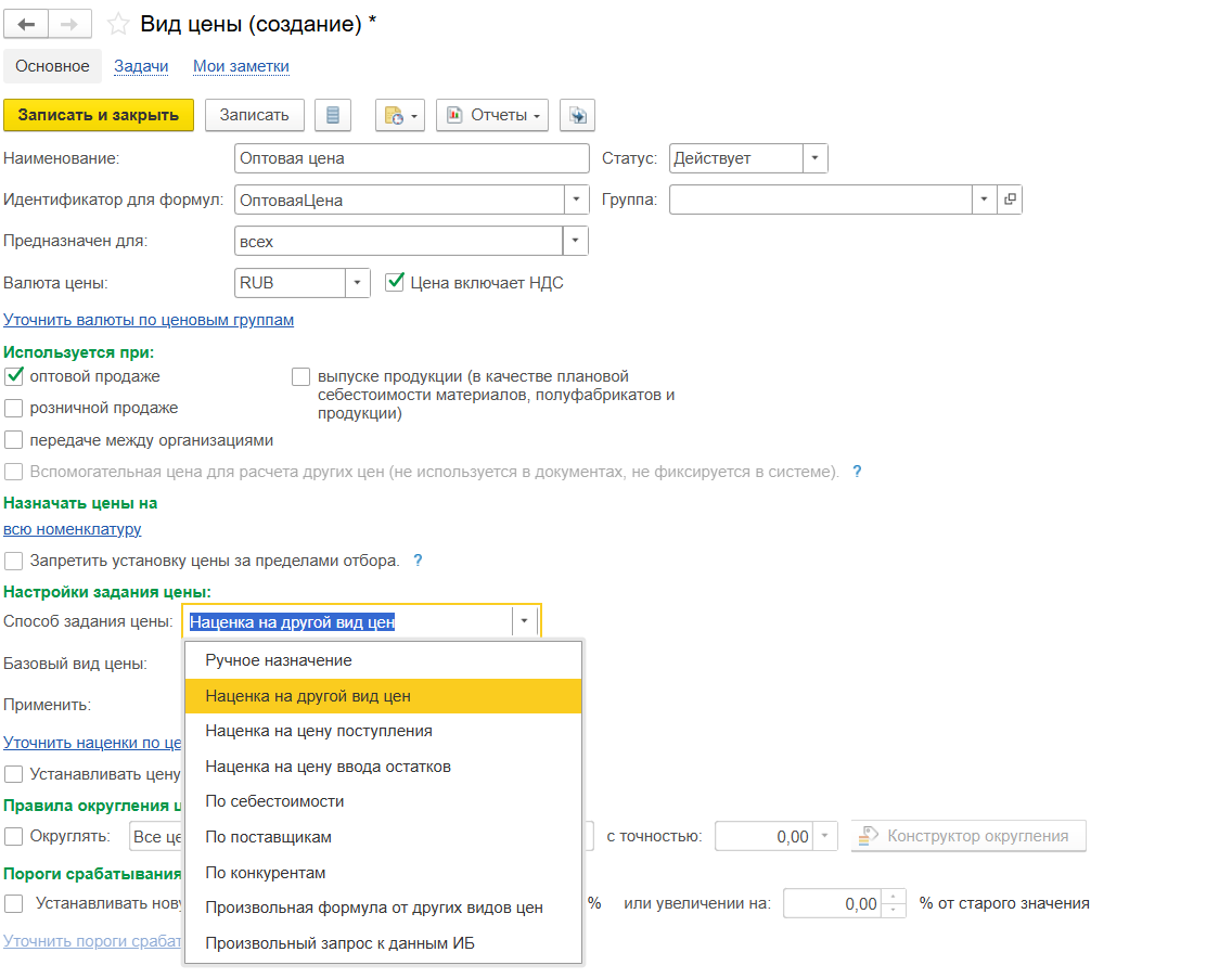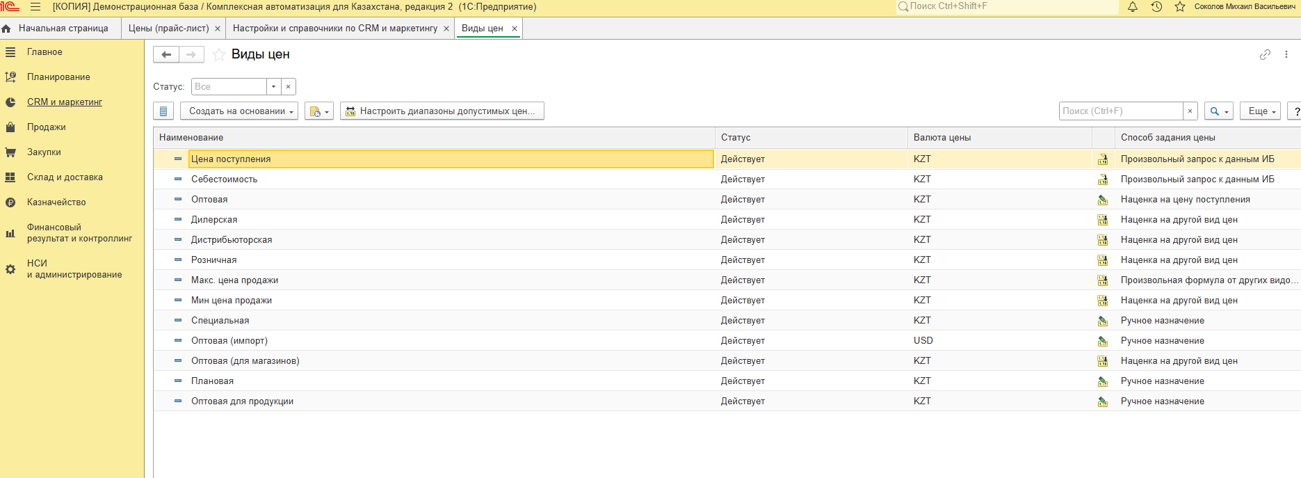 В 1С:КА предусмотрены различные механизмы для гибкого управления ценами. Основным инструментом ценообразования в 1С: КА является возможность настройки видов цен. Данный функционал позволяет компании настраивать автоматический расчет цен для разных групп клиентов, учитывая такие факторы, как объем закупок, лояльность клиента или текущая рыночная ситуация. Настройка данного справочника позволяет избежать ручной установки цен, снижая вероятность ошибок и экономя время.