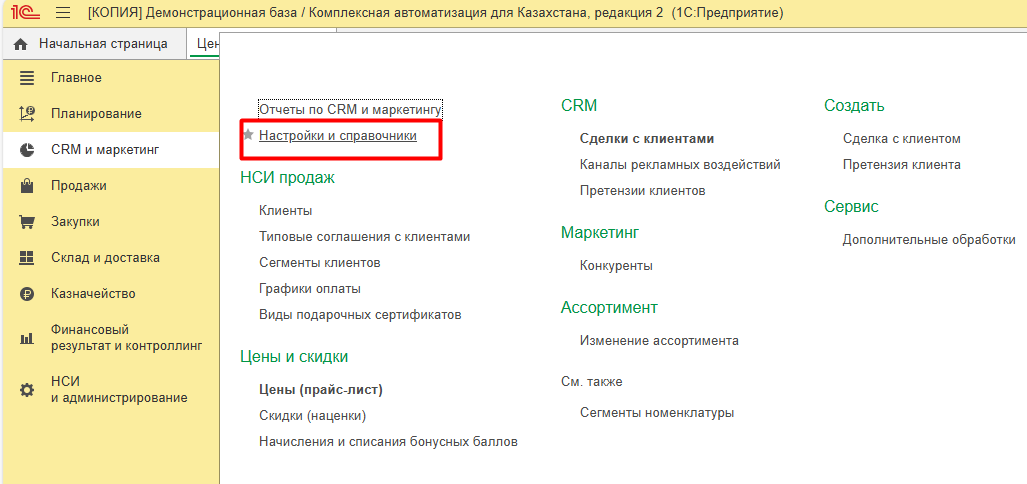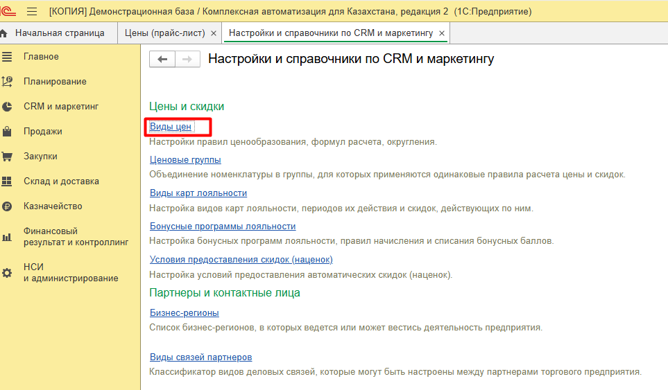 1. Параметры расчет цен в 1С: КА для Казахстана