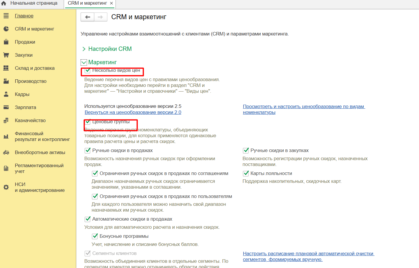 · Несколько видов цен – включение опции позволяет использовать более одного вида;