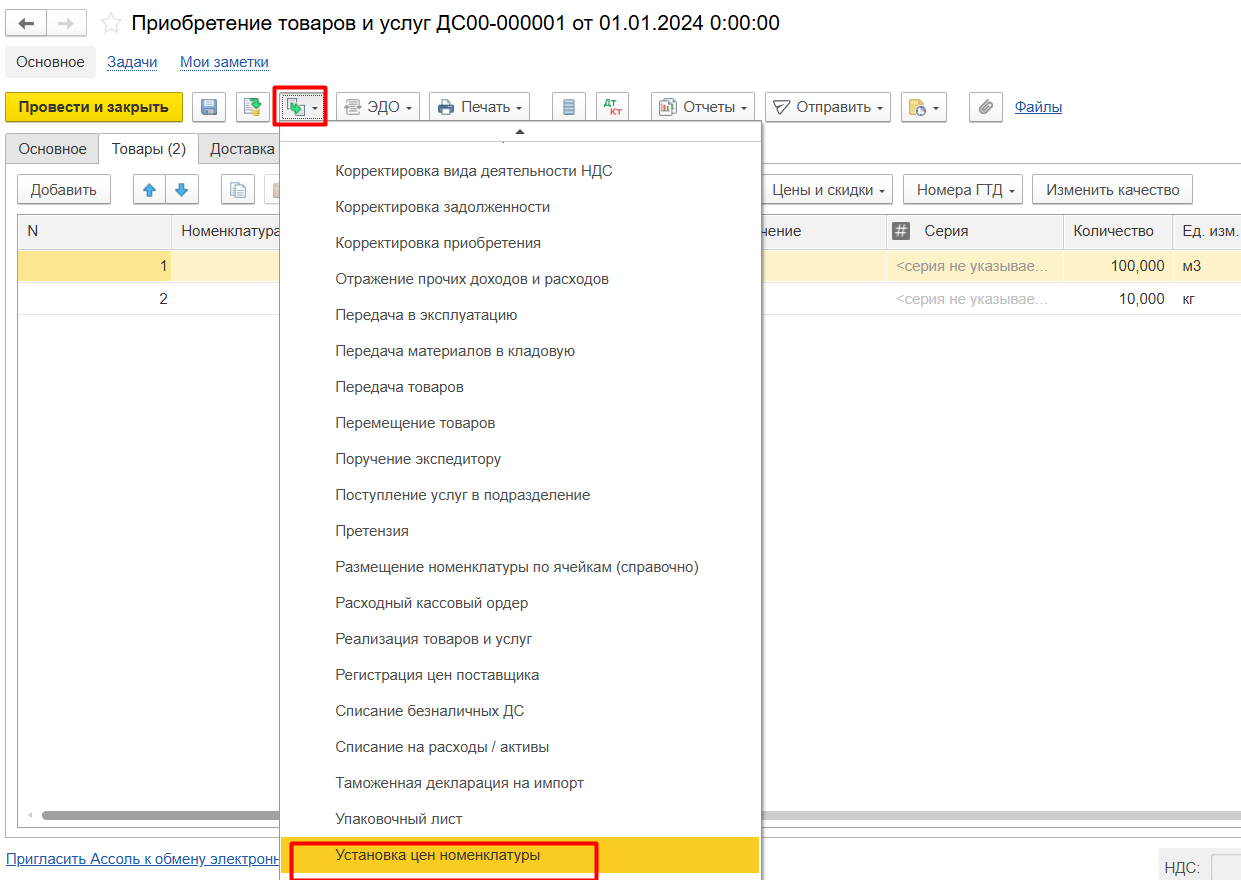 Создавать установку цен будет из документа поступления. Нажимаем на соответствующие команды в данном документе.