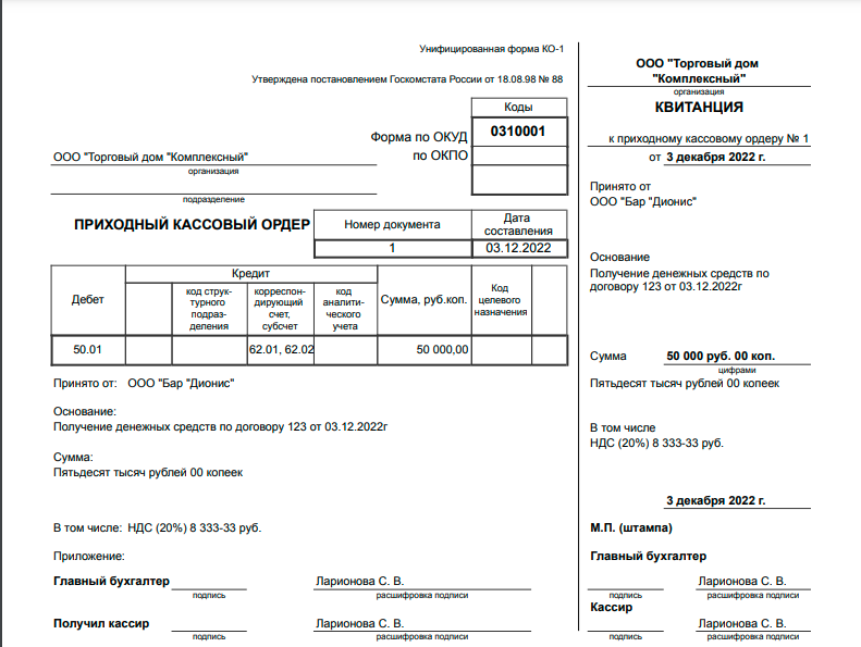 Сол сияқты, 1С жүйесінің конфигурациясында есеп беретін тұлғадан 1С-қа қайтару, банктен қолма-қол ақша алу операцияларының түрлері үшін кіріс кассалық ордерлер ресімделеді. Контрагенттен қарыз алу.