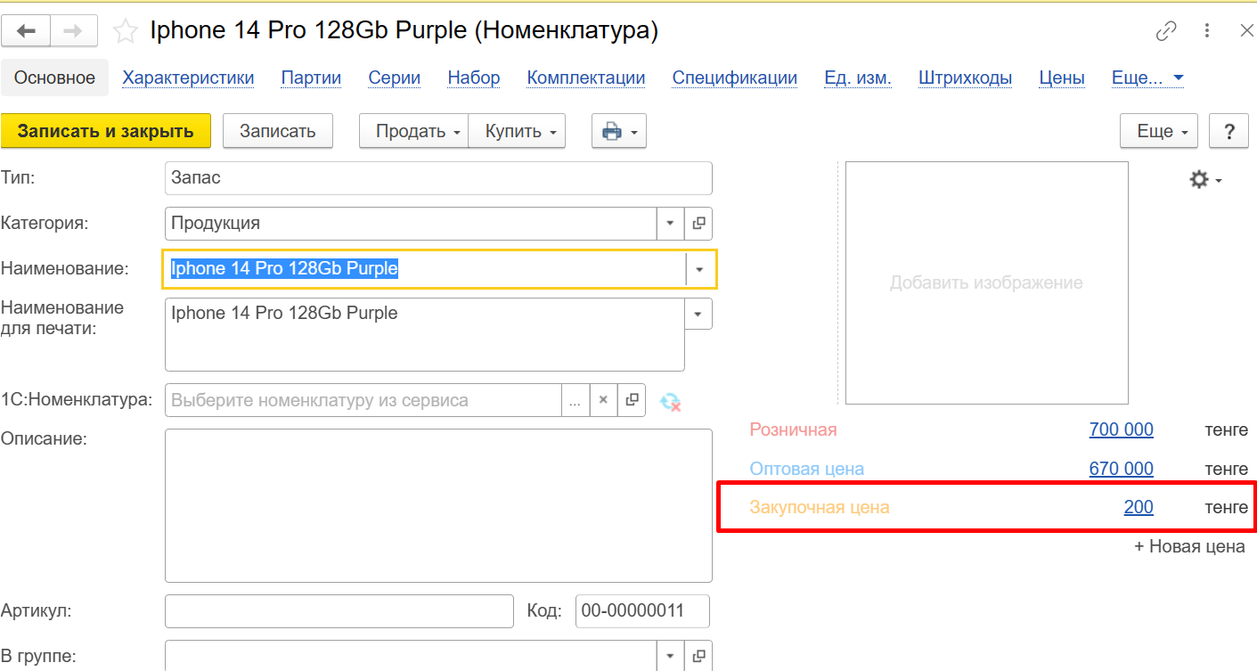 Открываем карточку товара в 1С, чтобы убедиться, что цена установлена.