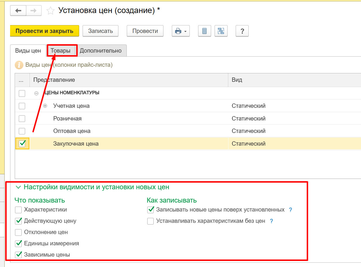 Выбираем закупочную цену 1С, параметры в нижней части формы не меняем. Переходим в Товары.