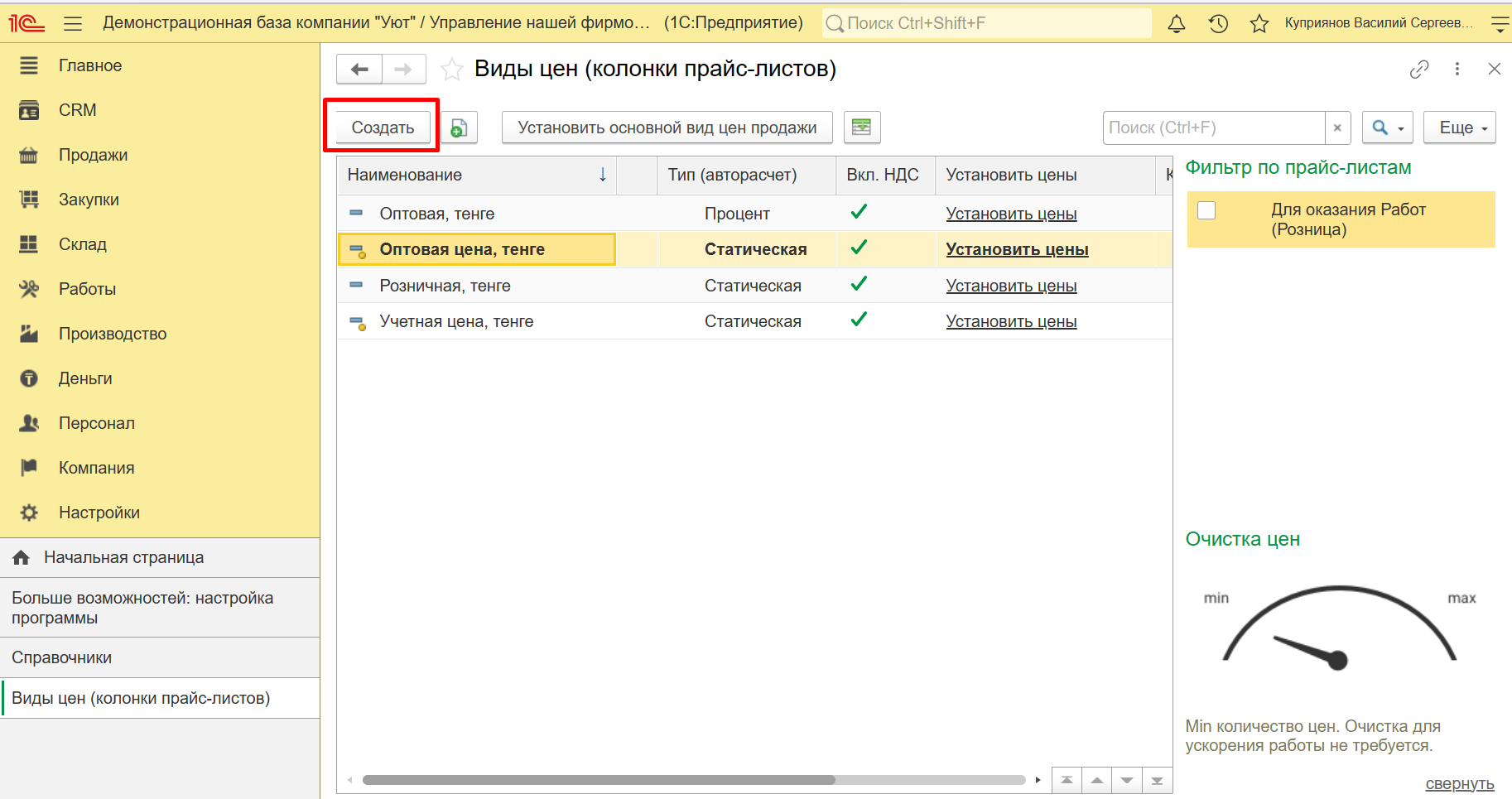 2. Установка цен в конфигурации 1С УНФ для Казахстана